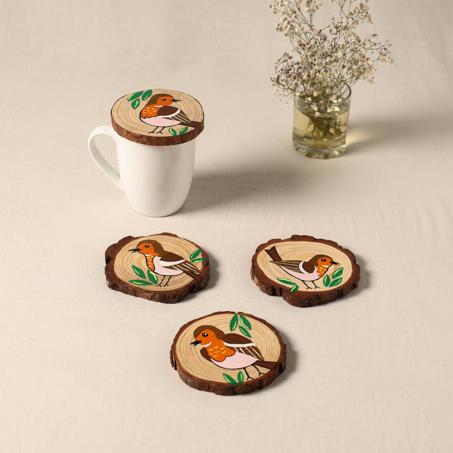 Orange handpainted coaster (set of 4), crafted by Vidushi Tamrakar on pine wood using acrylic colors. Each coaster features bird-inspired designs with fine detailing and vibrant tones. Designed to protect your surfaces, this set also adds a lively, artistic touch to your table setting.