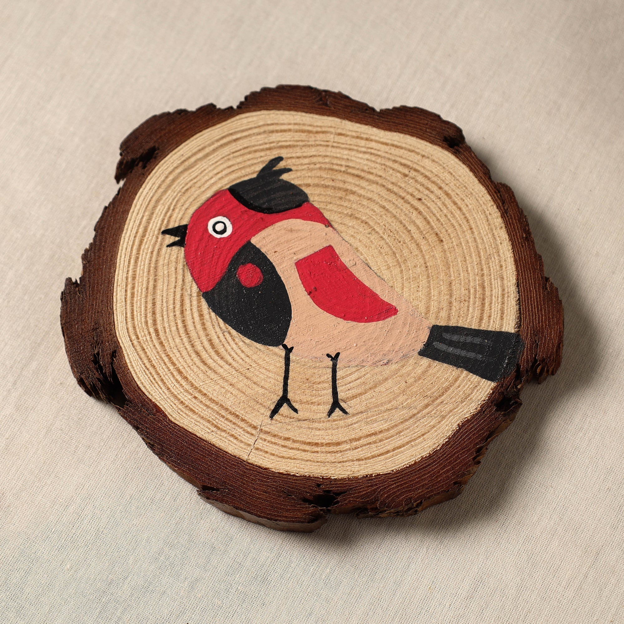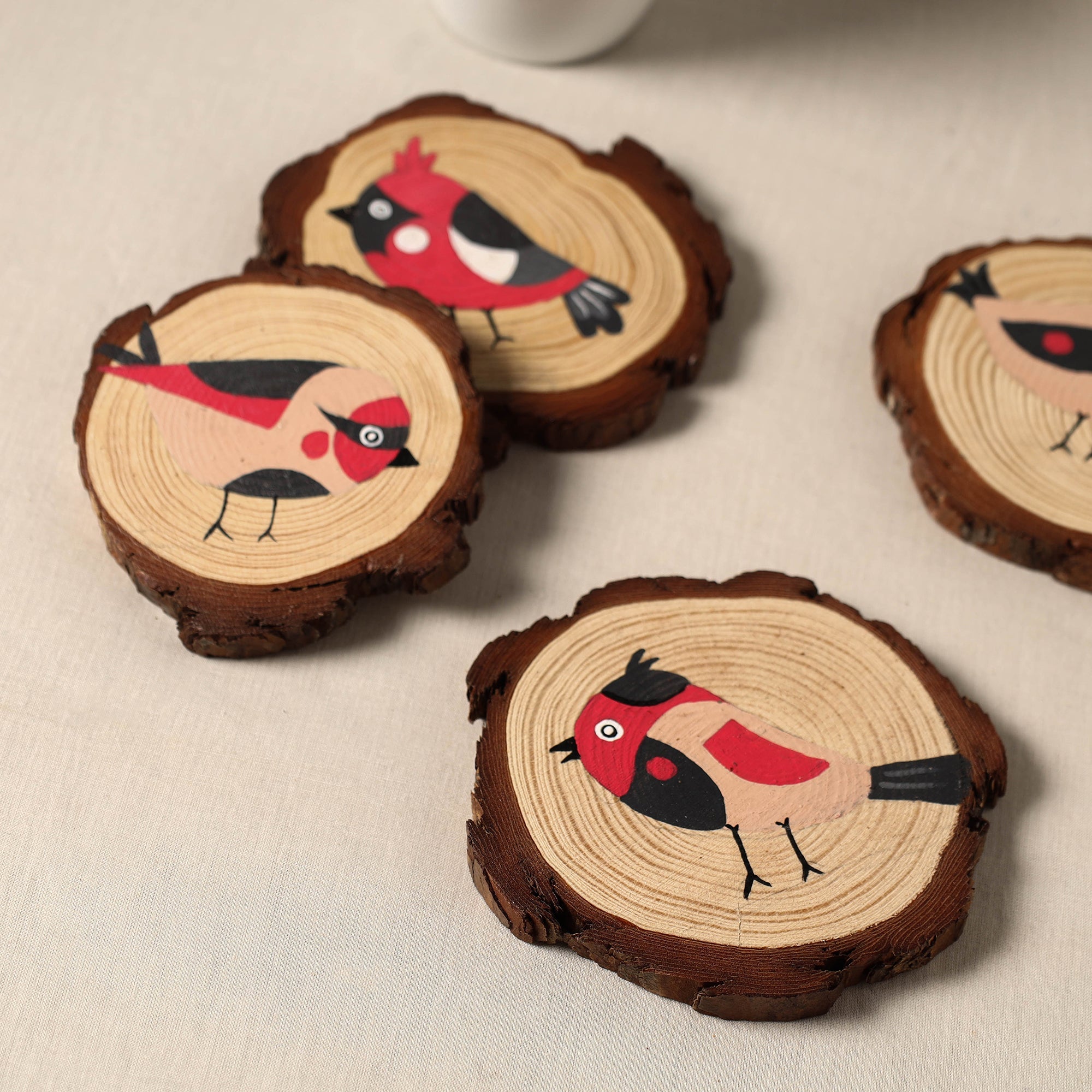 Red handpainted coaster (set of 4), crafted by Vidushi Tamrakar on pine wood using acrylic colors. Each coaster features bird-inspired designs with fine detailing and vibrant tones. Designed to protect your surfaces, this set also adds a lively, artistic touch to your table setting.