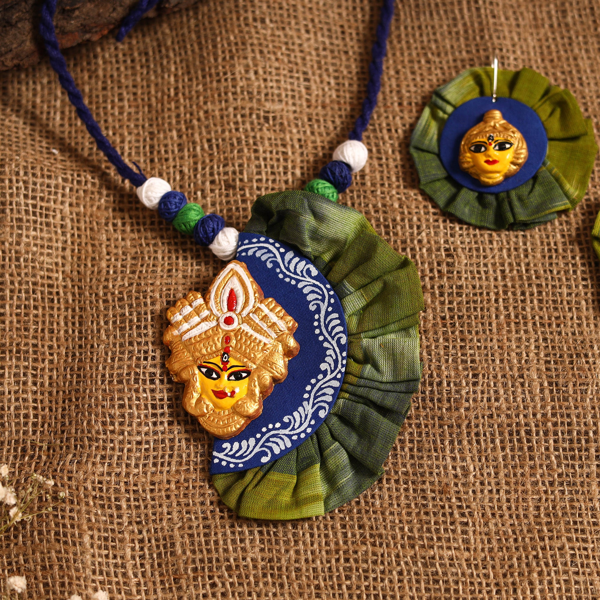 Green - Bishnupur Handpainted Fabart Clay Maa Durga Necklace Set 02