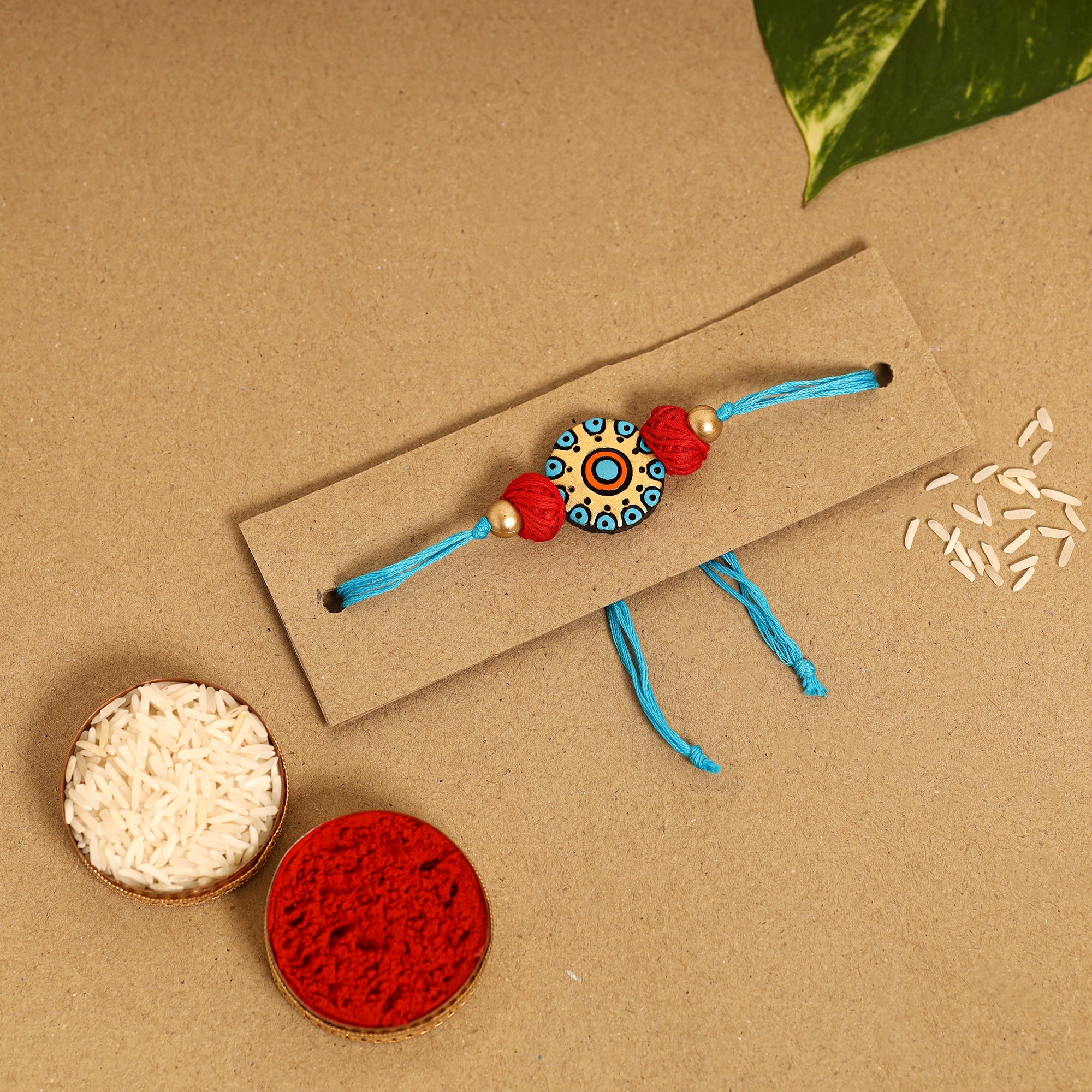 | Material | Celebrate the bond of love and affection with our exquisite bishnupur hand-painted terracotta rakhi, meticulously handcrafted by skilled artisans from Bishnupur, West Bengal, renowned for their intricate painting techniques. From delicate elements like beads to refined threadwork, each rakhi is distinctive in its detailing. |