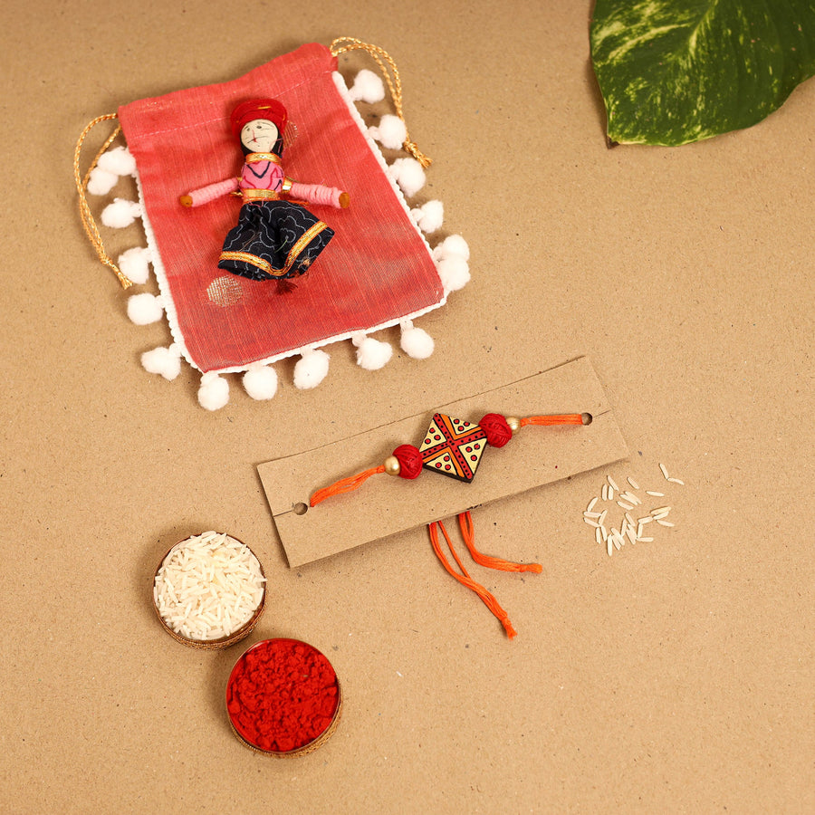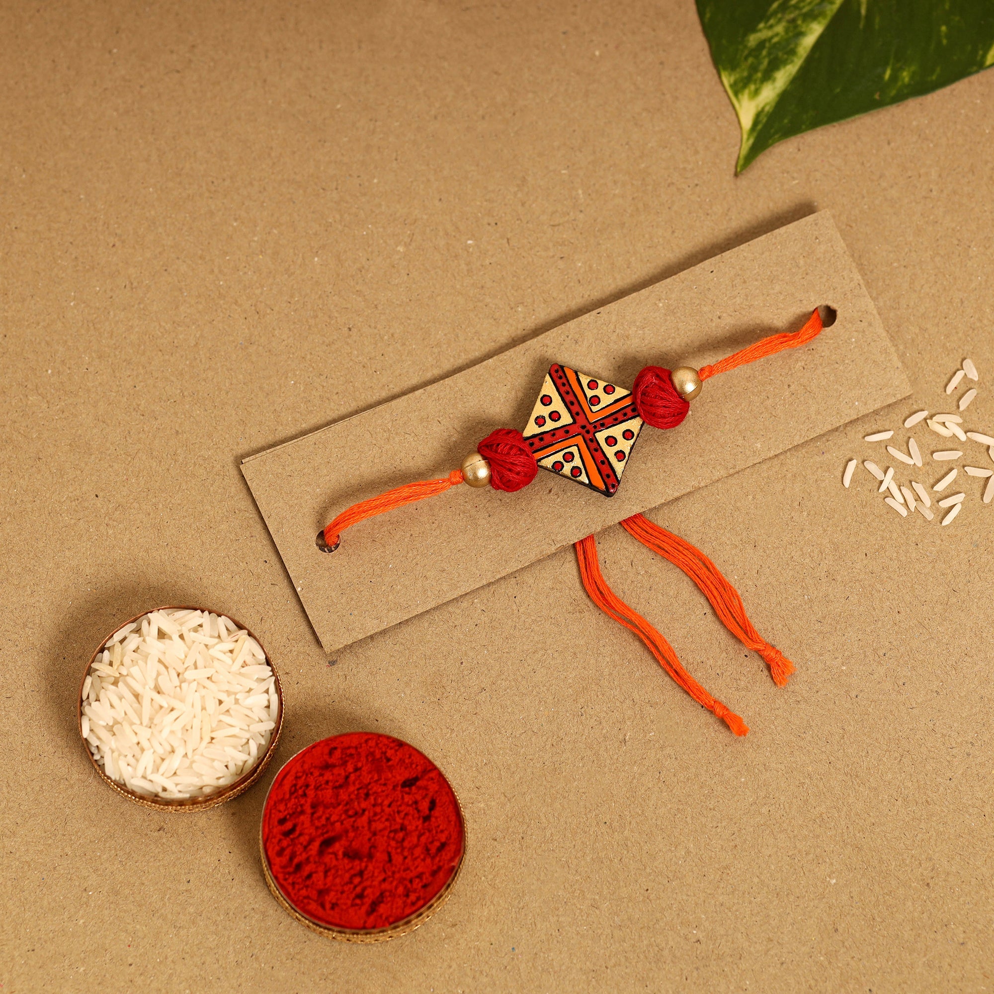 | Material | Celebrate the bond of love and affection with our exquisite bishnupur hand-painted terracotta rakhi, meticulously handcrafted by skilled artisans from Bishnupur, West Bengal, renowned for their intricate painting techniques. From delicate elements like beads to refined threadwork, each rakhi is distinctive in its detailing. |