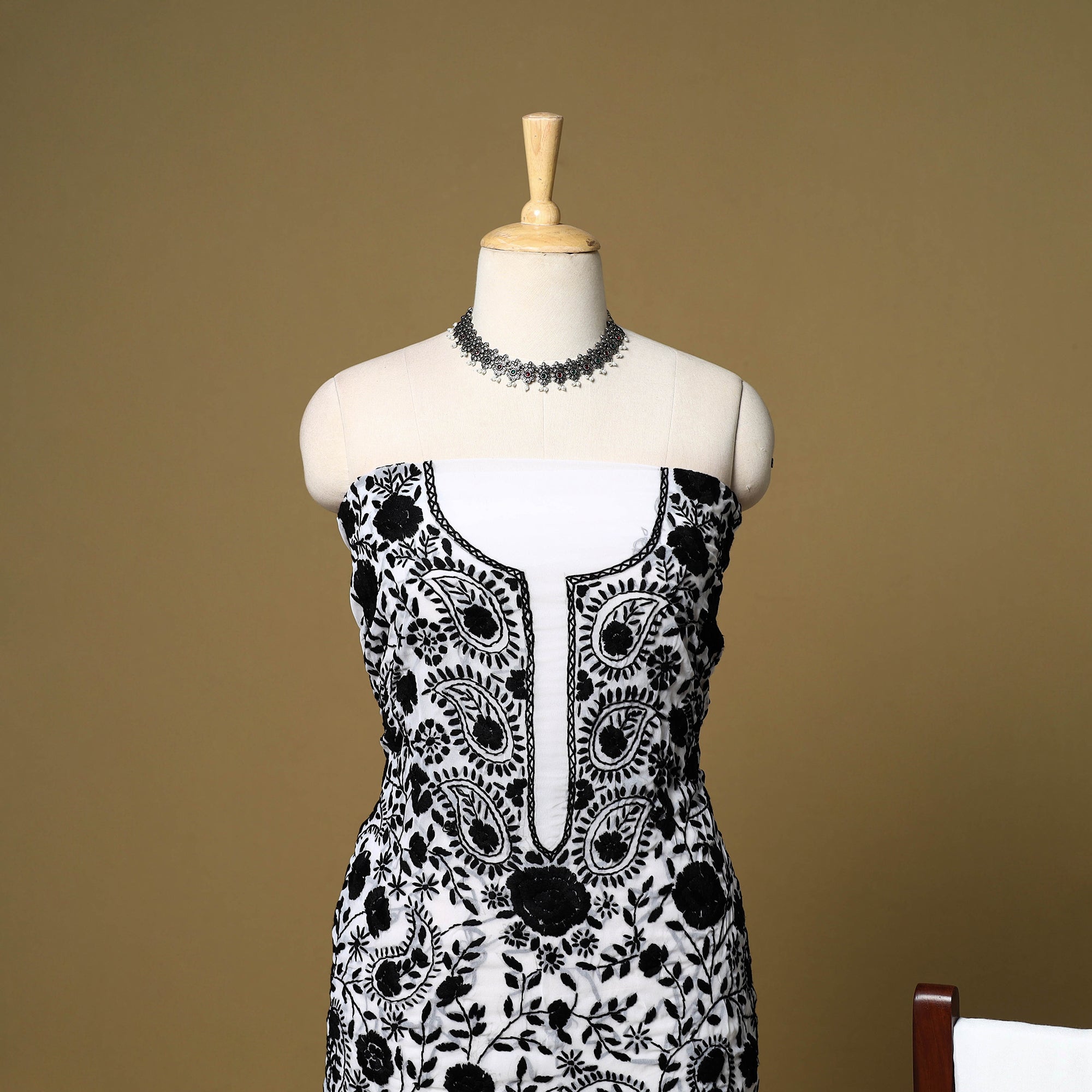 Indulge in the beauty of chapa work phulkari embroidery with this georgette 3-piece suit material set with plain santoon (viscose-cotton) bottom material. Phulkari, meaning "flower" and "kari," meaning craft, is a traditional embroidery art from Punjab, India. It uses floral motifs and is done with woolen threads. This suit material set allows you to unleash your creativity and create a unique outfit that reflects the rich tradition of Phulkari embroidery. Ideal for festive and ethnic wear.