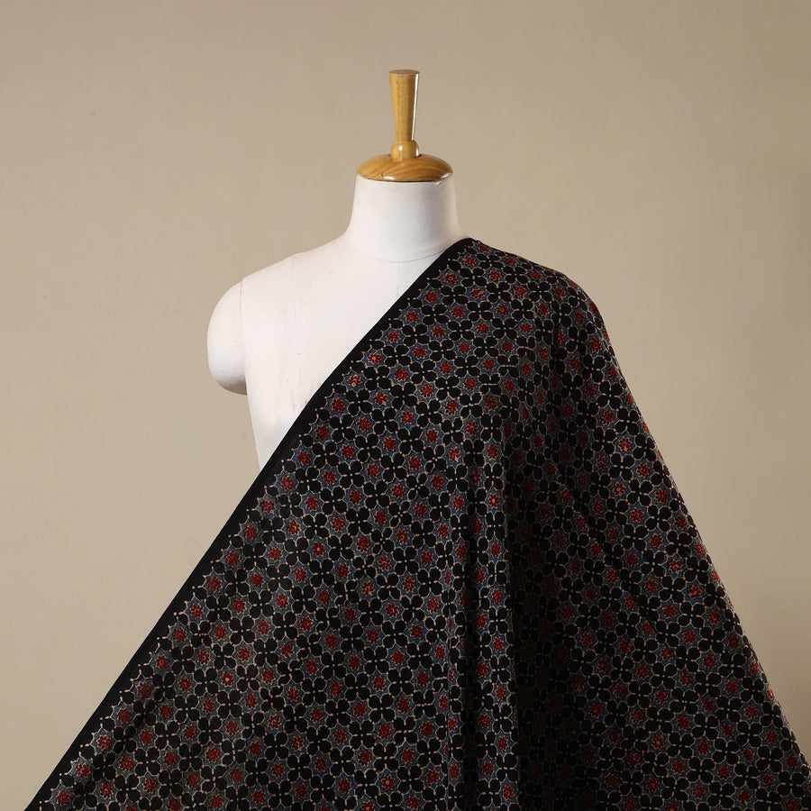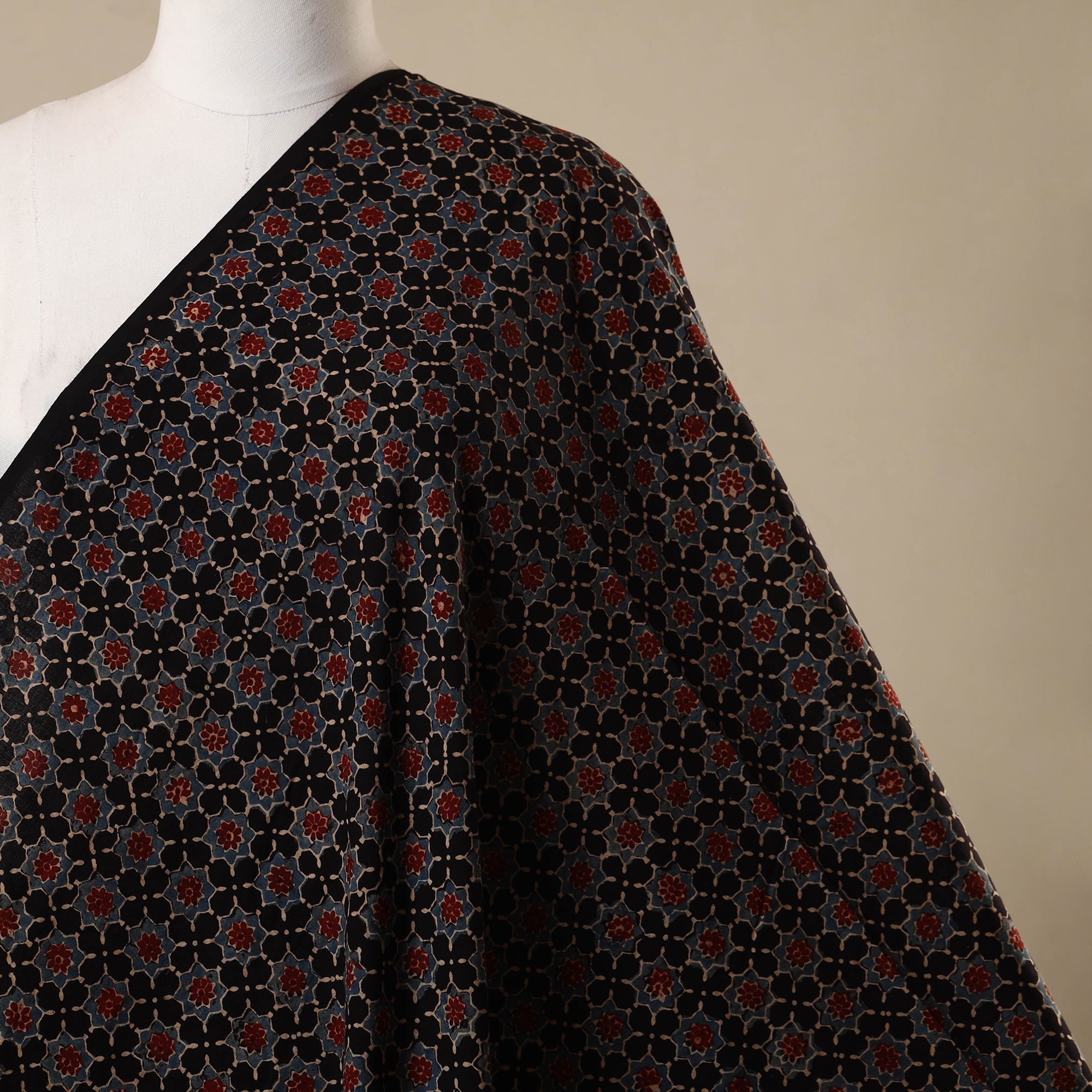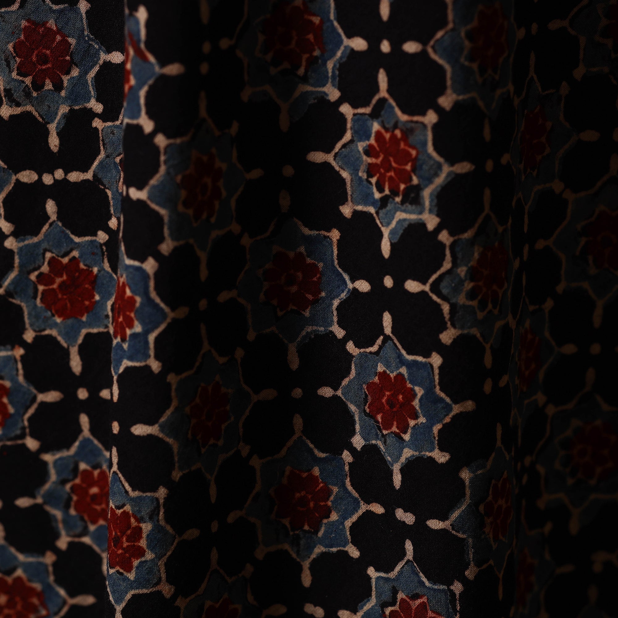 Black ajrakh fabric is hand block-printed in Kutch using natural dyes and age-old techniques passed down through generations. Crafted with precision, each motif reflects Gujarat’s rich textile heritage. Made of breathable cotton, it's ideal for creating kurtas, shirts, dresses, or even elegant home decor accents.
