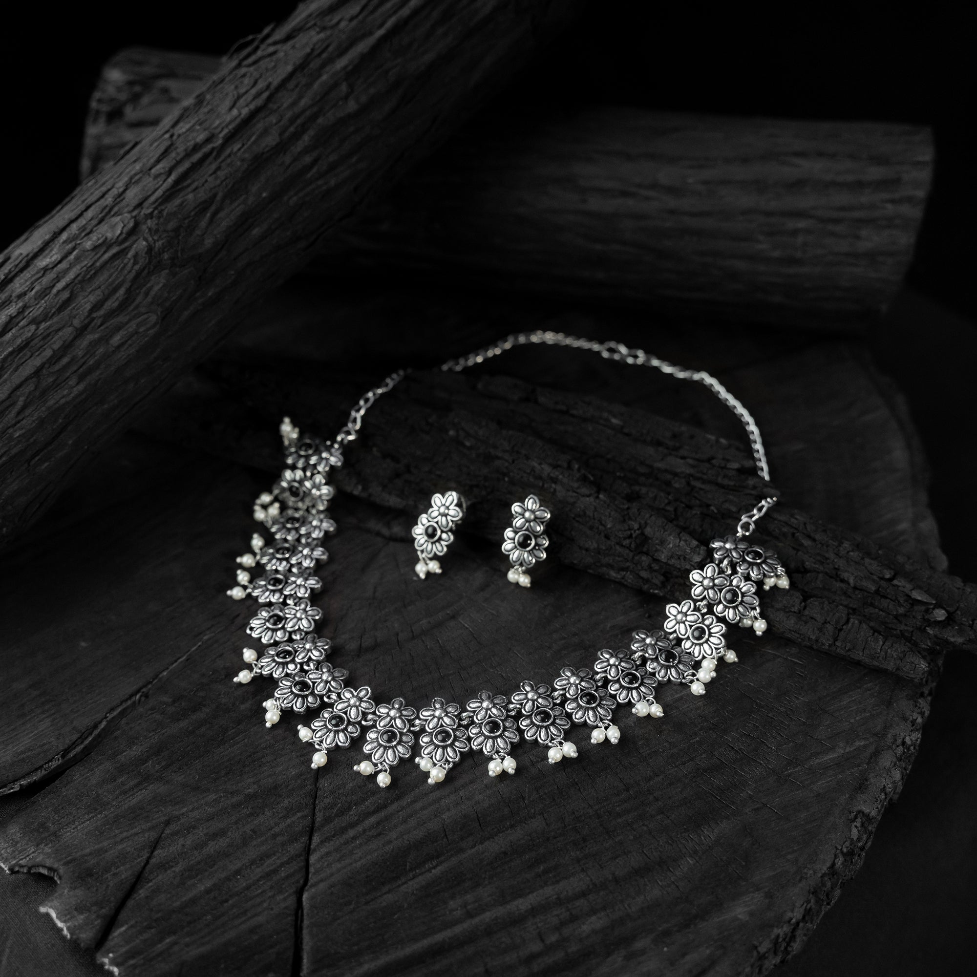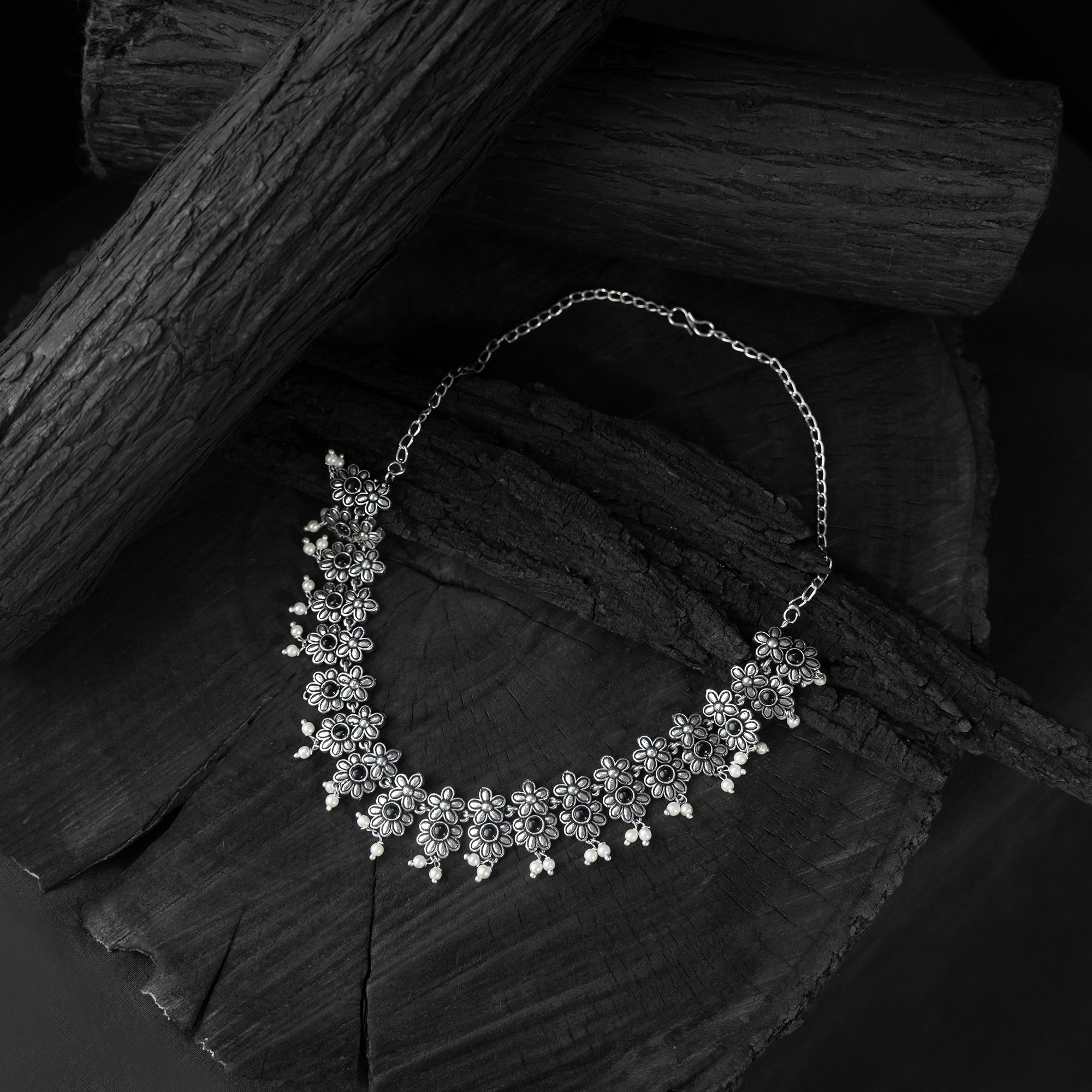 Oxidised handcrafted black necklace set features intricate detailing using varied materials like metal, stones, pearls and artistic motifs. Perfect for festive occasions, weddings, office wear or casual styling it pairs beautifully with sarees, kurtas, or contemporary outfits. Complete with matching earrings, this set makes for a thoughtful gift for mother, sister, wife, or girlfriend adding beauty and grace to every special moment.