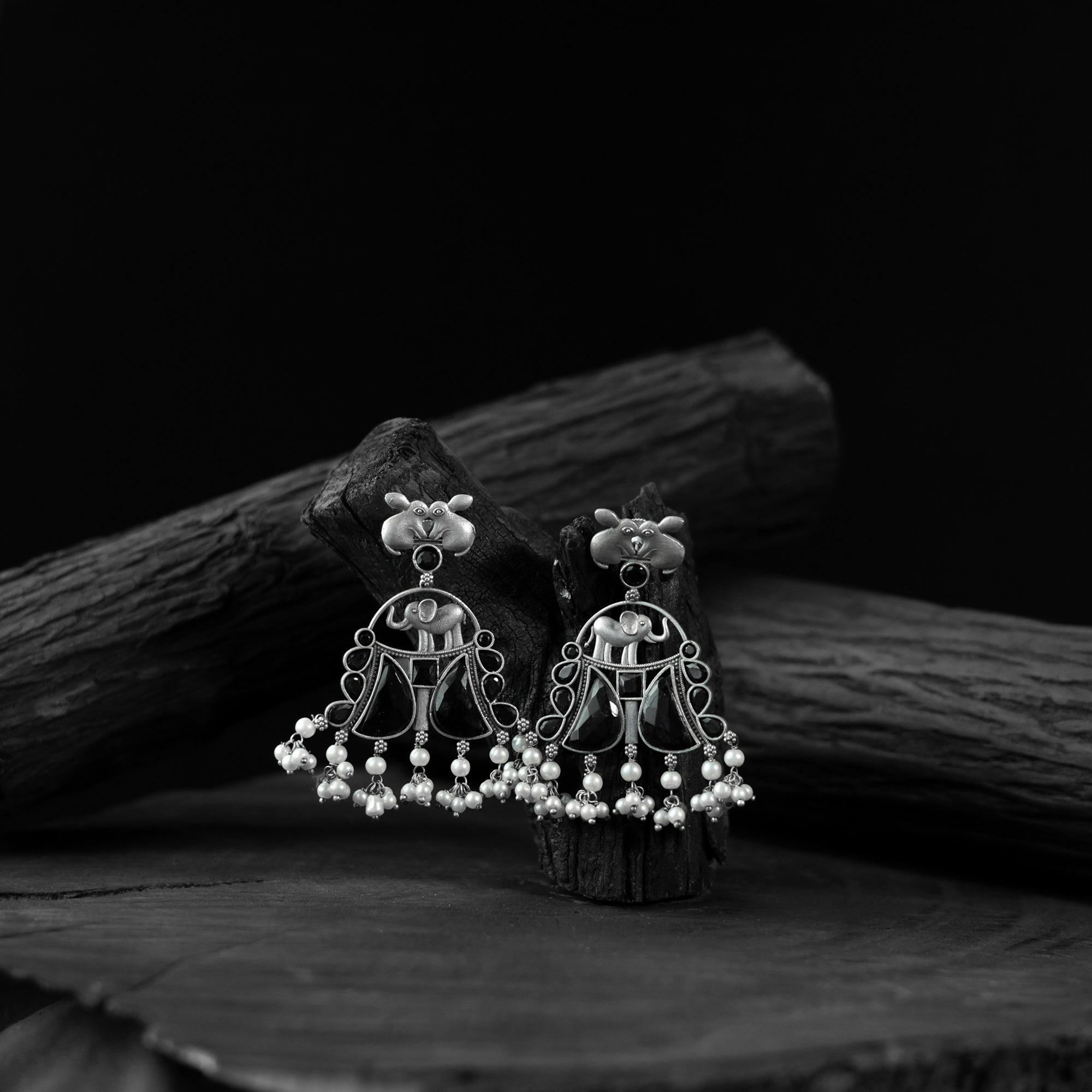 Oxidised handcrafted black earrings made with a blend of metal, stones, pearls, beads, and fine detailing. Perfect for festive occasions, weddings, casual outings, office wear, or vacations. Their elegant black and silver tones pair beautifully with everything from casual jeans and flowy dresses to chic office ensembles. A meaningful gift for mother, sister, wife, or girlfriend adding a beautiful touch of tradition to every moment.