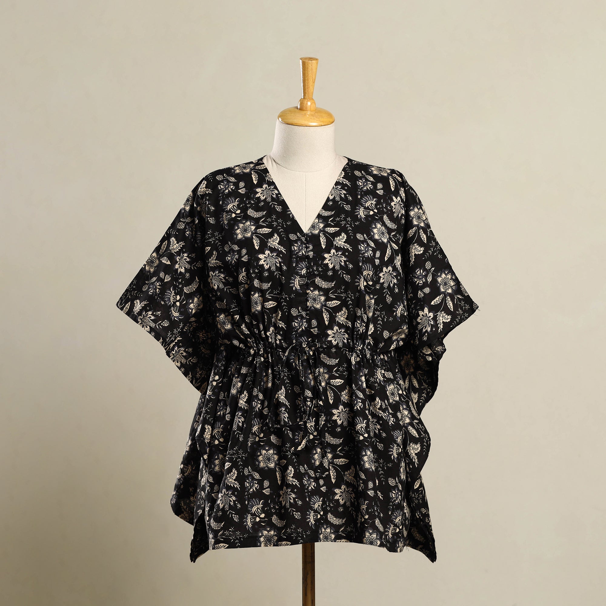 Stay comfy and stylish in this black block print bagru cotton kaftan. A traditional kaftan is an short-length garment with long flowing sleeves. These loose-fitting cotton kaftans are enhanced by a soft touch and beautiful hand prints.