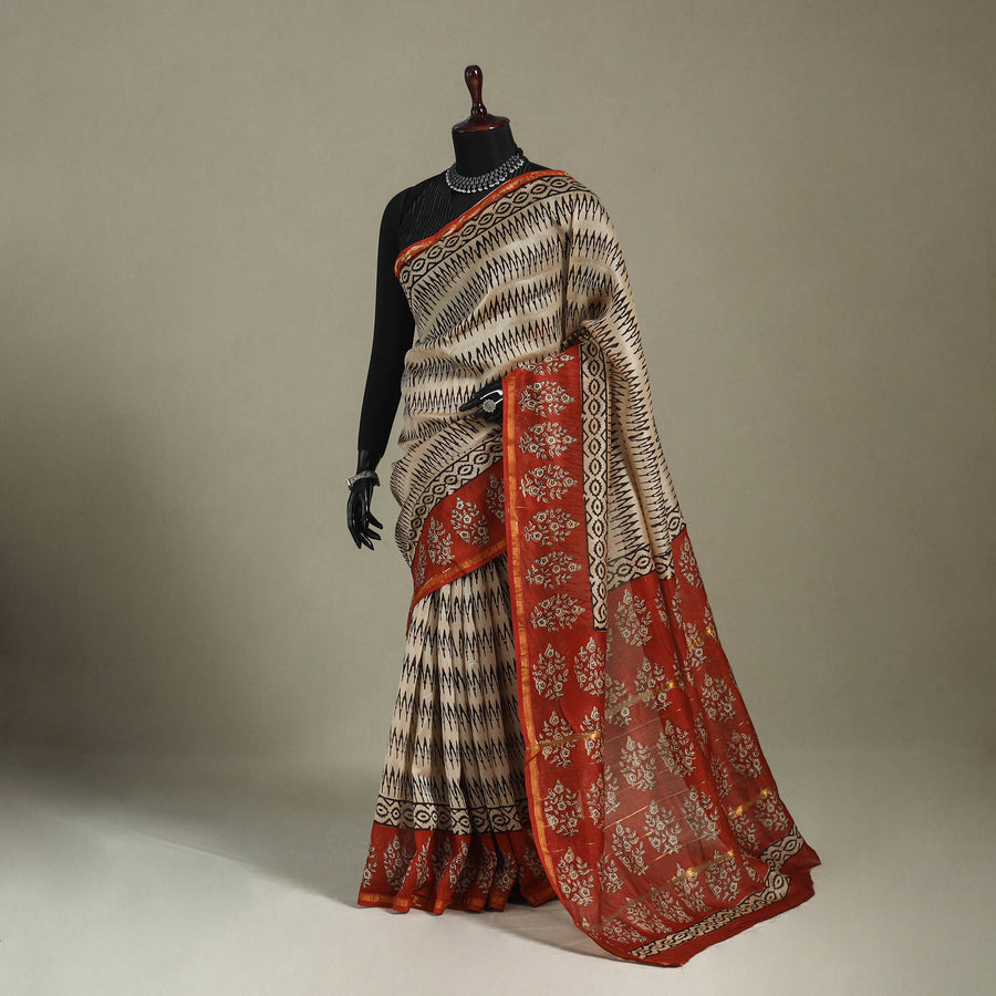 Experience the charm of this beige hand block-printed bagru chanderi silk-cotton saree with a zari border, featuring intricate patterns and rich hues made using natural dyes. It seamlessly blends elegance with cultural heritage. Perfect for festive occasions, everyday wear, or as a thoughtful gift, this saree brings timeless grace and a refined artisanal touch to your wardrobe.