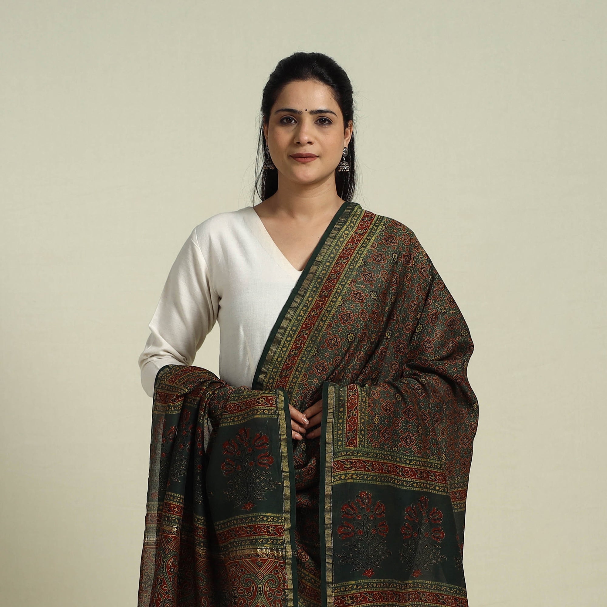 Adorn yourself with this exquisite green block-printed chanderi silk cotton handloom ajrakh dupatta, a true reflection of India’s rich textile heritage. Designed by skilled artisans using traditional ajrakh block printing techniques, it showcases intricate patterns and deep, vibrant hues. Crafted from lightweight and breathable chanderi silk cotton, this dupatta drapes gracefully, making it an elegant choice for festive occasions, formal gatherings, or everyday wear.
