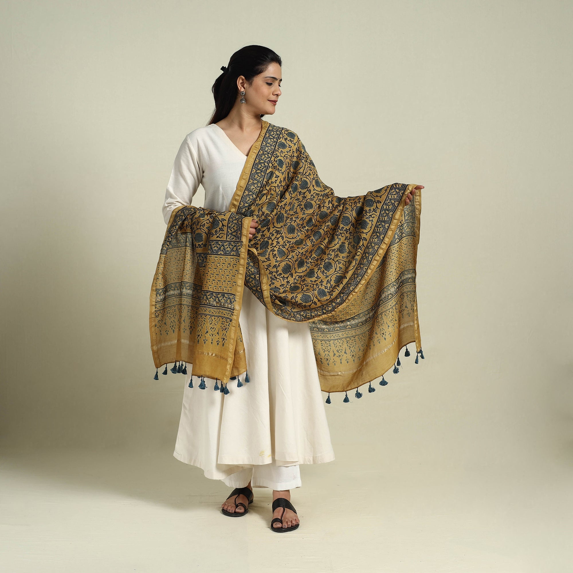 Adorn yourself with this exquisite brown block-printed chanderi silk cotton handloom ajrakh dupatta, a true reflection of India’s rich textile heritage. Designed by skilled artisans using traditional ajrakh block printing techniques, it showcases intricate patterns and deep, vibrant hues. Crafted from lightweight and breathable chanderi silk cotton, this dupatta drapes gracefully, making it an elegant choice for festive occasions, formal gatherings, or everyday wear.