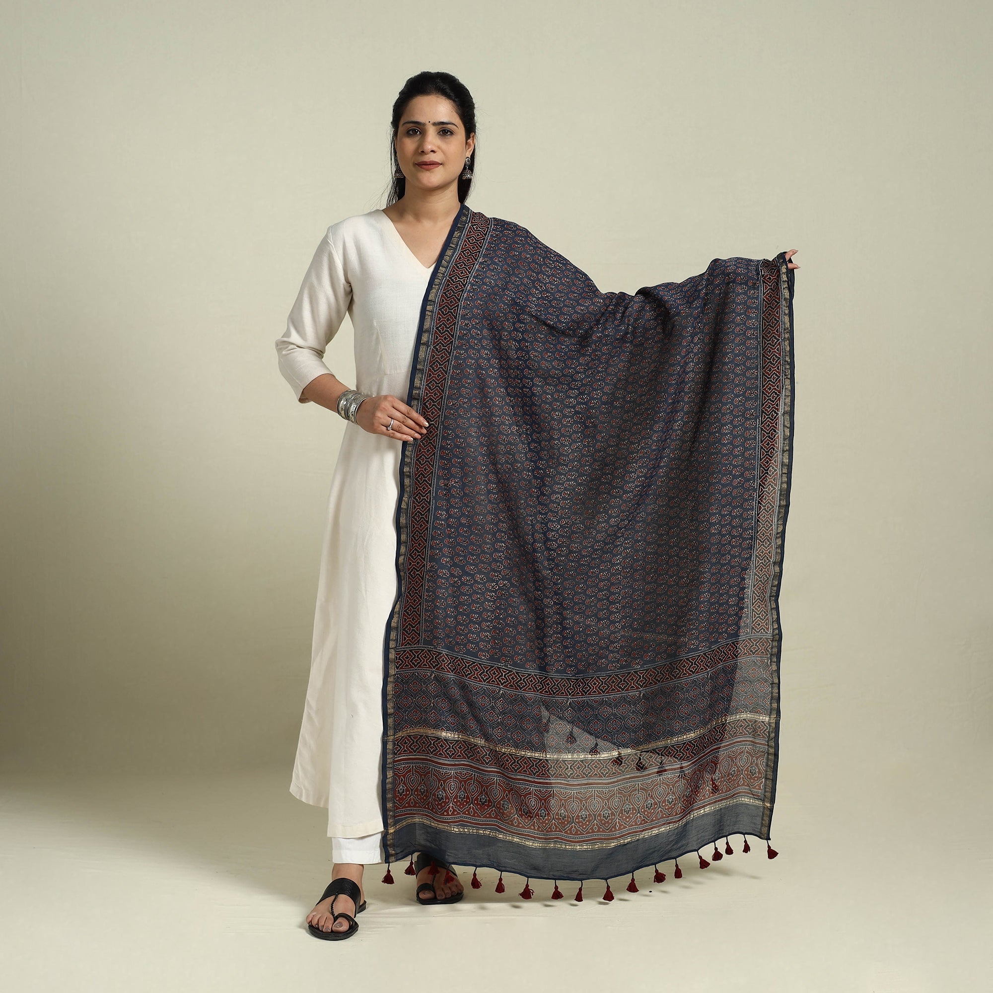 Adorn yourself with this exquisite blue block-printed chanderi silk cotton handloom ajrakh dupatta, a true reflection of India’s rich textile heritage. Designed by skilled artisans using traditional ajrakh block printing techniques, it showcases intricate patterns and deep, vibrant hues. Crafted from lightweight and breathable chanderi silk cotton, this dupatta drapes gracefully, making it an elegant choice for festive occasions, formal gatherings, or everyday wear.