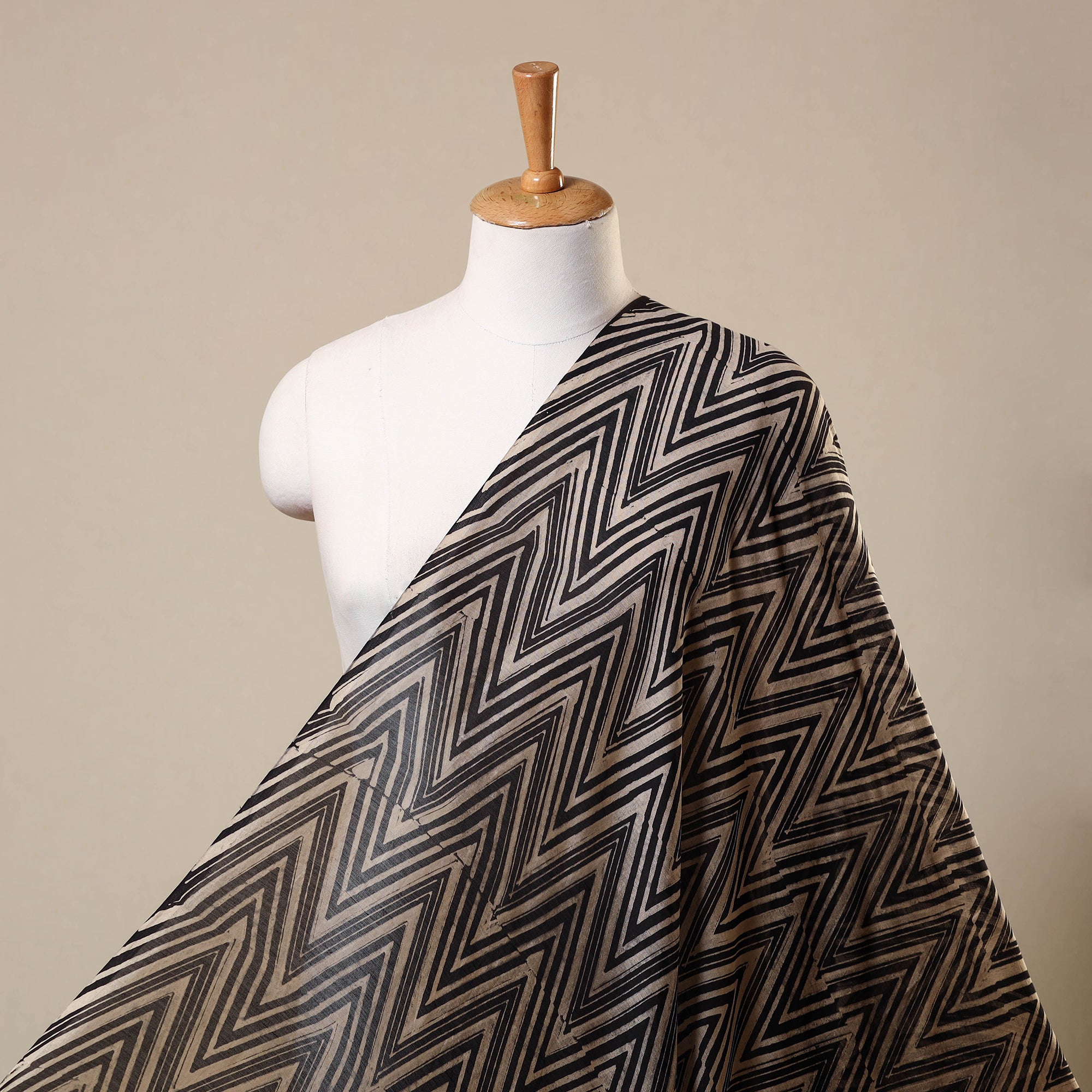 Handcrafted in Kutch by artisan Sufiyan Ismail Khatri, this black handloom chanderi silk ajrakh textile features intricate block printing. Created using carved wooden blocks and natural dyes, its motifs are inspired by centuries-old ajrakh traditions. Lightweight and versatile, it's perfect for tailoring kurtas, dresses, or blouses. A true reflection of India’s rich textile legacy.