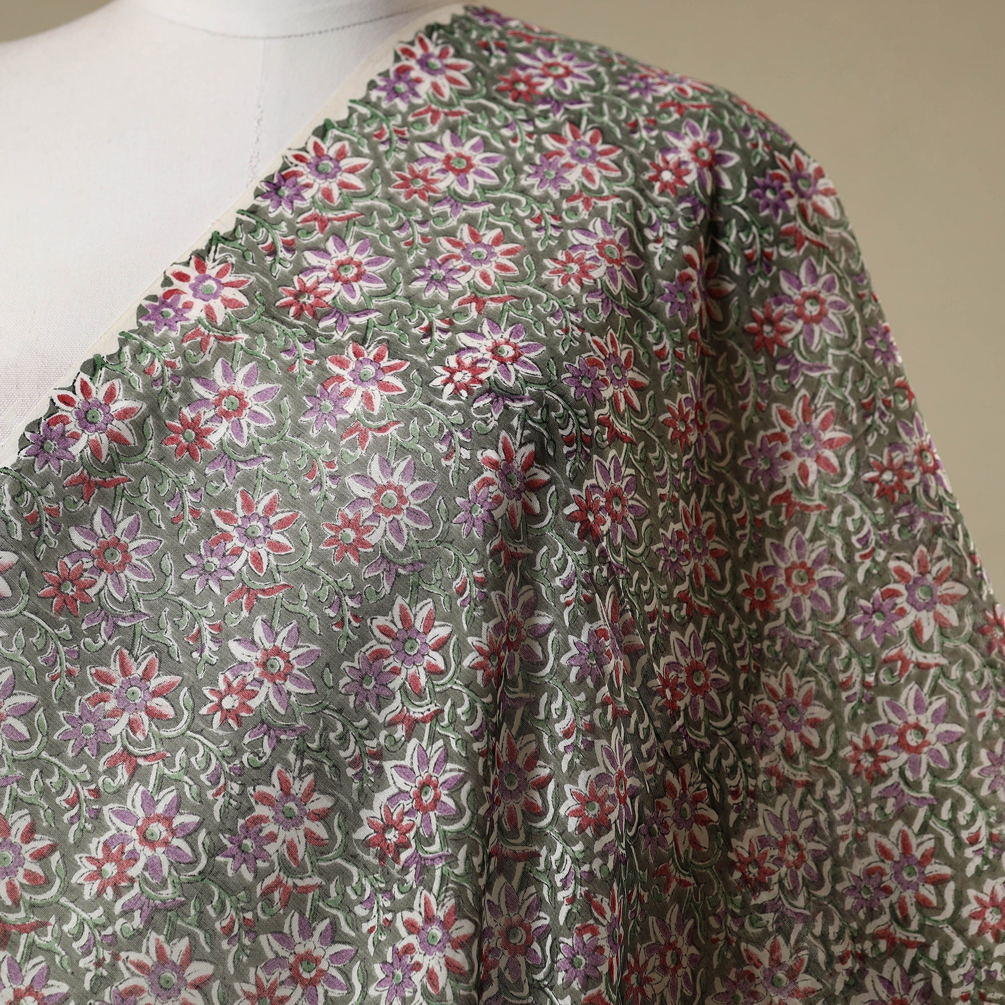Discover the elegance of green chanderi silk-cotton adorned with sanganeri block prints. Artisans from Sanganer, Jaipur imprint classic floral designs using wooden blocks, creating a fabric that blends heritage with beauty. Its airy, lightweight texture is well suited for kurtas, flowy dresses, tunics, and refined home décor pieces.