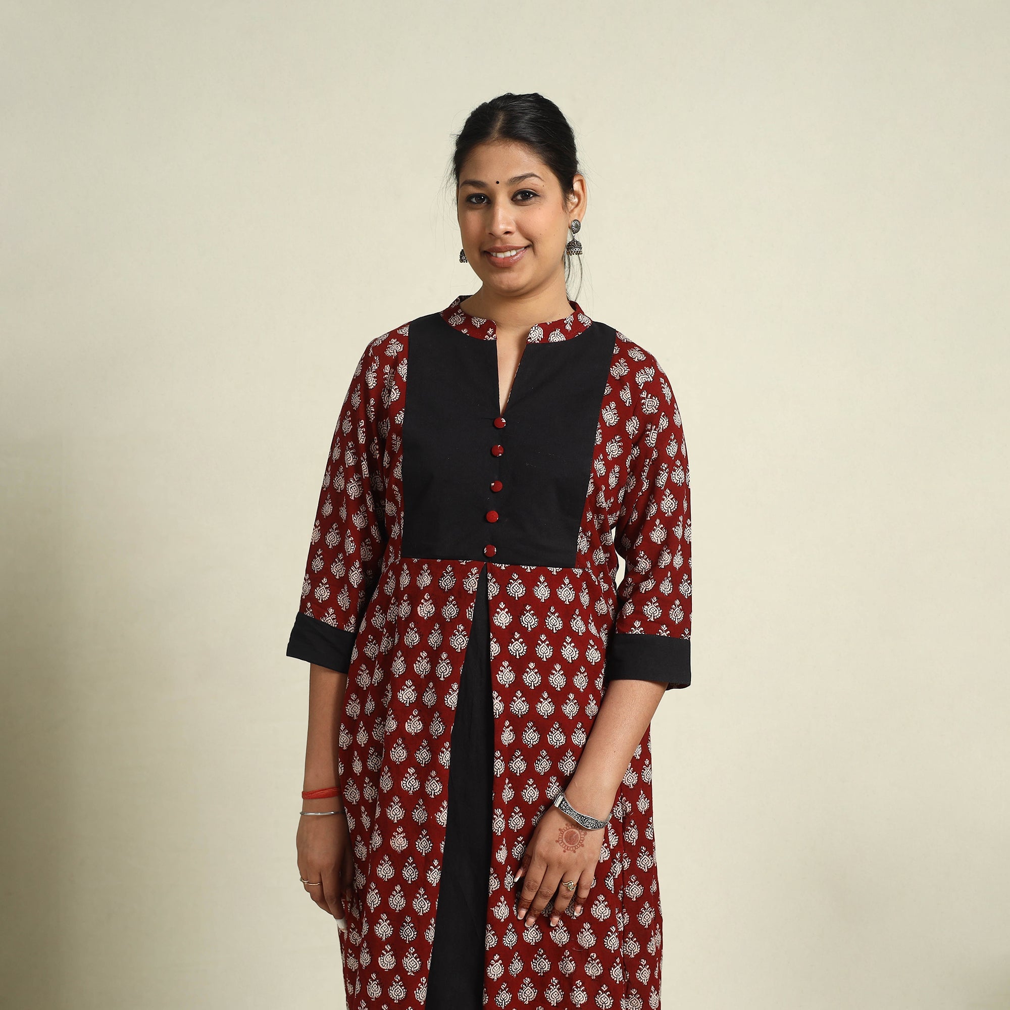 Add a cultural touch to your style with this maroon block print mul cotton a-line maroon bagh kurta. Handcrafted using the traditional bagh block printing technique, each design showcases intricate and vibrant patterns. Made from soft, breathable cotton and dyed with eco-friendly natural colours, this kurta offers a seamless blend of comfort and timeless style. Whether for casual outings or festive moments, this kurta is an essential addition to your wardrobe.