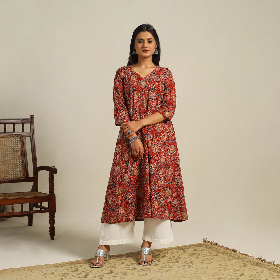 This Red A-line cotton kurta embraces the soul of Kalamkari, made using handcrafted wooden blocks and natural dyes. The detailed motifs reflect heritage passed down through generations. Featuring a relaxed shape with a single-side pocket, it's a versatile choice for routine errands or cultural gatherings alike.
