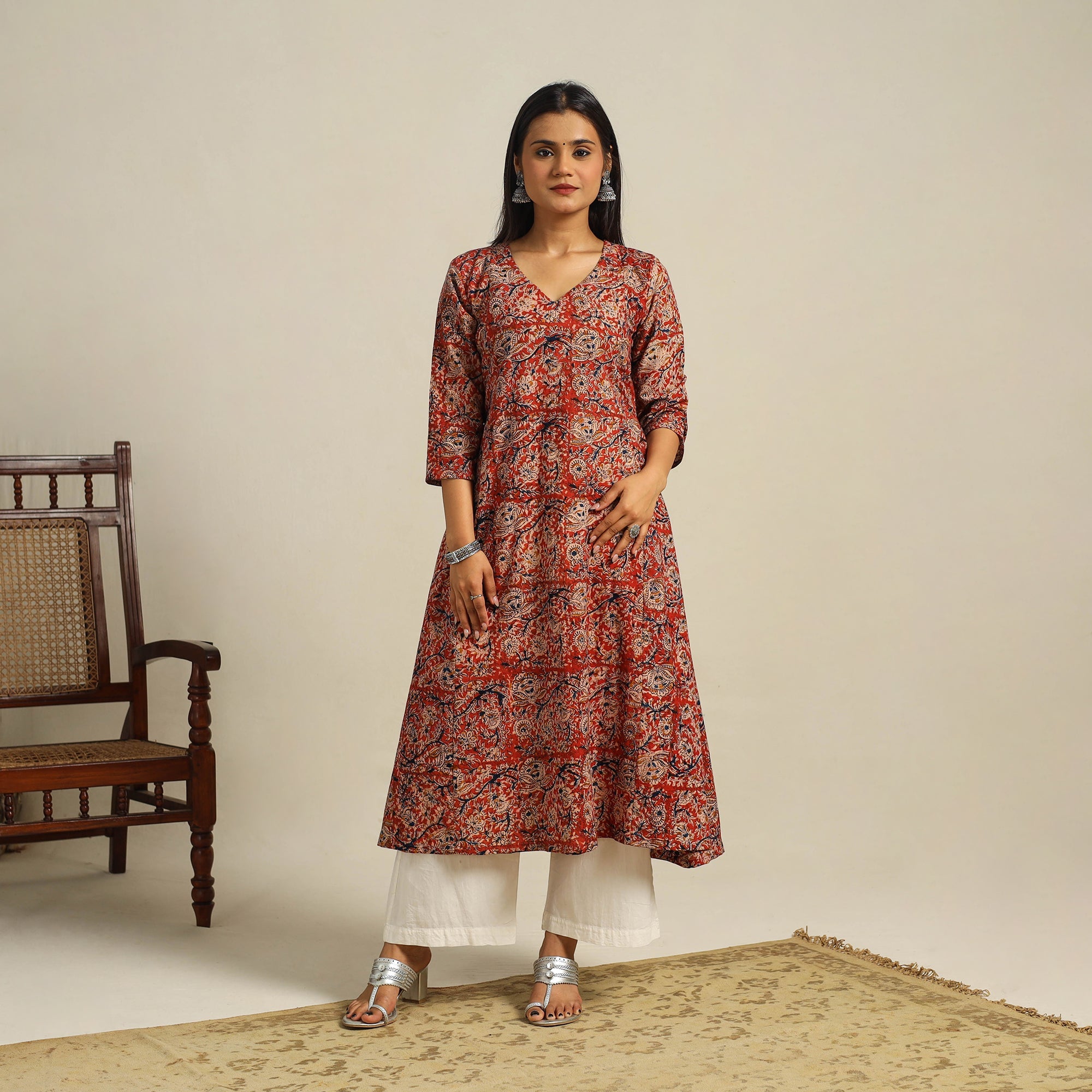 This Red A-line cotton kurta embraces the soul of Kalamkari, made using handcrafted wooden blocks and natural dyes. The detailed motifs reflect heritage passed down through generations. Featuring a relaxed shape with a single-side pocket, it's a versatile choice for routine errands or cultural gatherings alike.