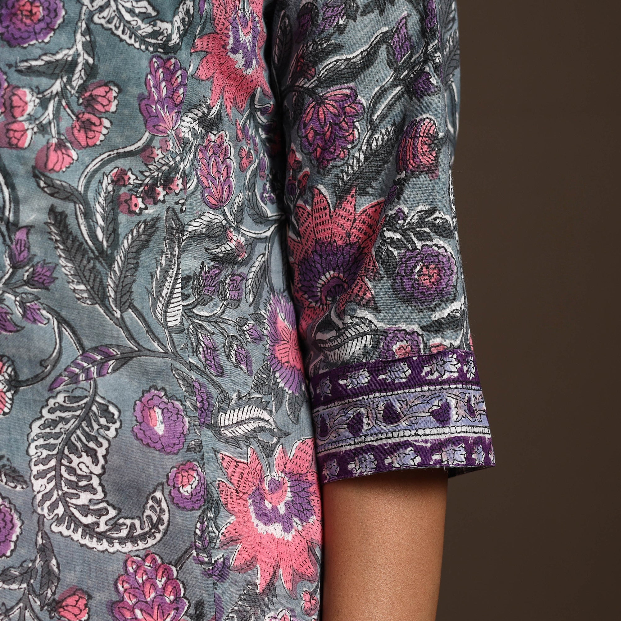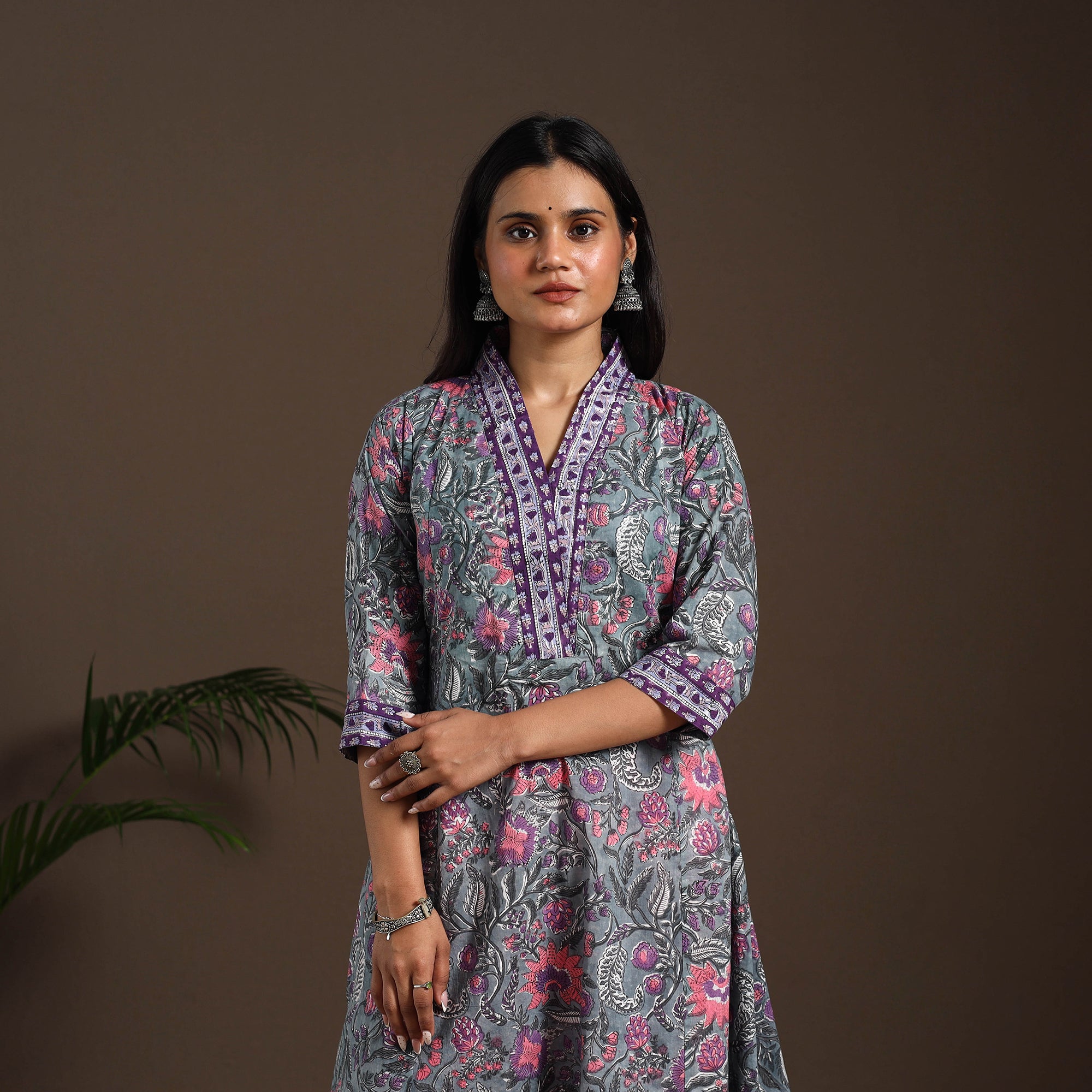 This blue sanganeri block-printed A-line kurta is crafted from breathable cotton. Featuring a handy side pocket and floral motifs made with traditional wooden blocks of Sanganer, it is perfect for daily wear, office looks, festive gatherings, or travel. The silhouette blends comfort with effortless elegance.
