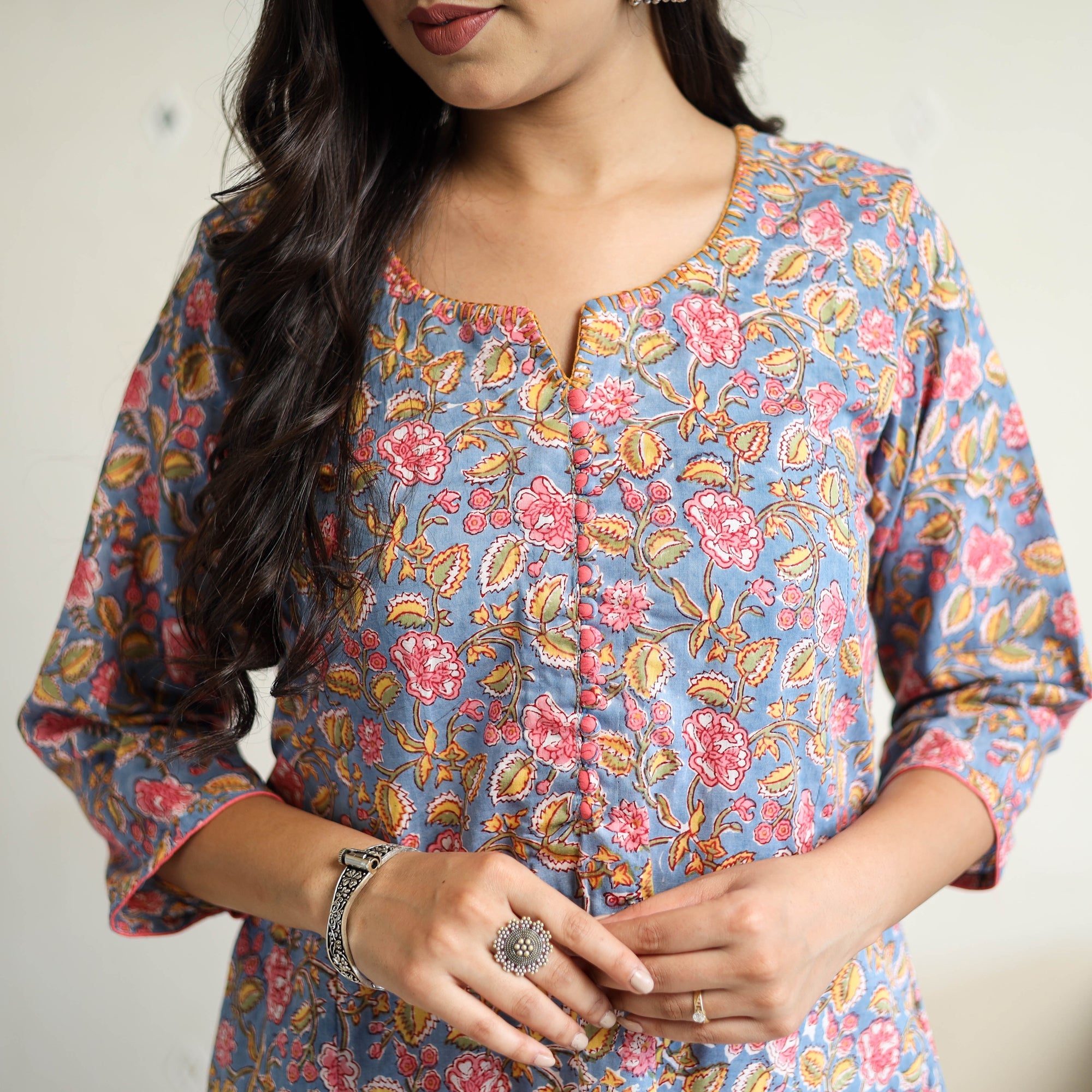 This blue sanganeri block-printed A-line kurta is crafted from breathable cotton and beautifully adorned with hand embroidery. It includes a functional side pocket for convenience. The floral motifs are printed using traditional wooden blocks, showcasing the authentic block printing native to Sanganer. Perfect for both casual outings and festive occasions.