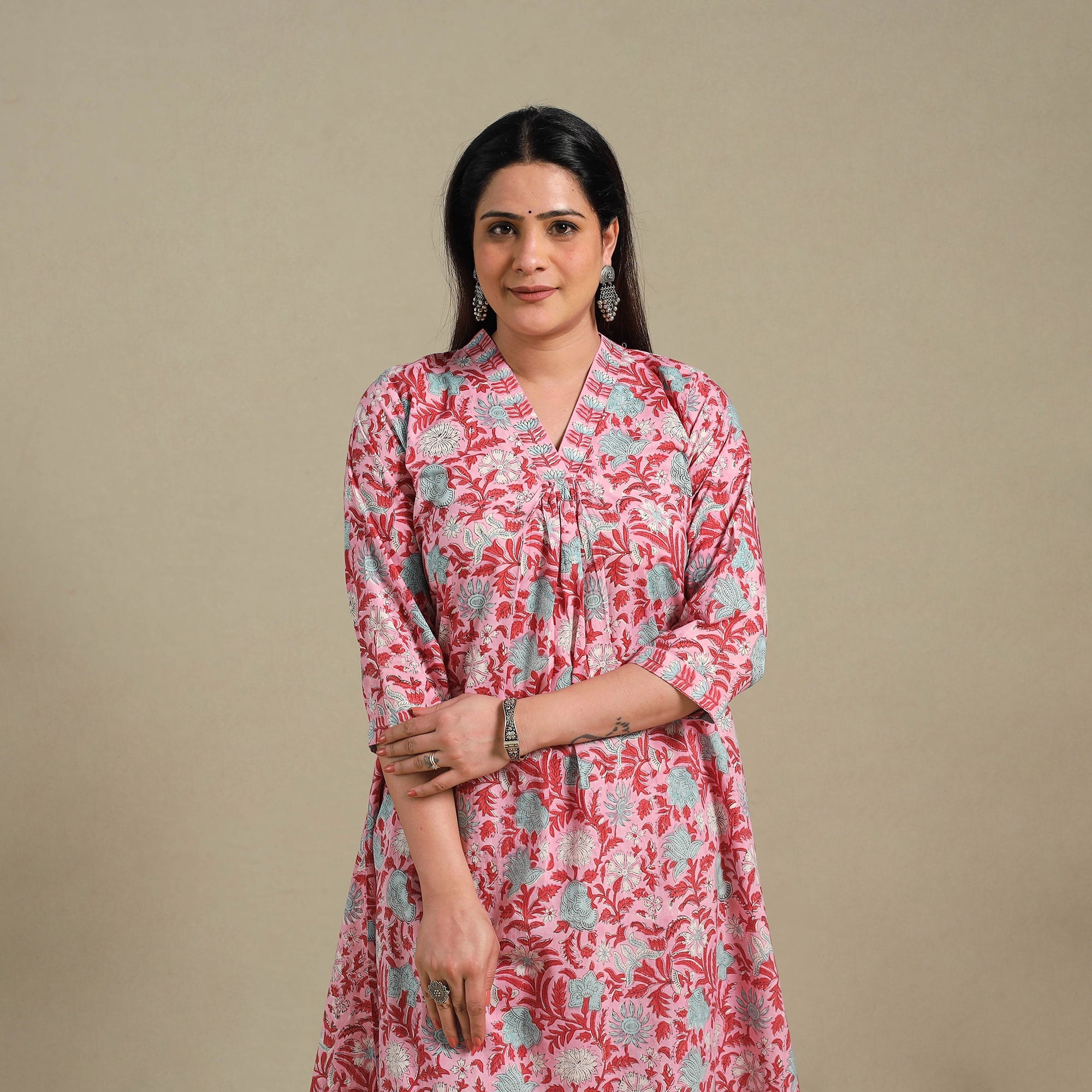 This pink sanganeri block-printed A-line kurta is made from soft, breathable cotton. It features a side pocket and floral motifs crafted using traditional wooden blocks from Sanganer. Ideal for daily wear, office outfits, festive occasions, or travel, this silhouette offers a seamless blend of comfort and effortless charm.