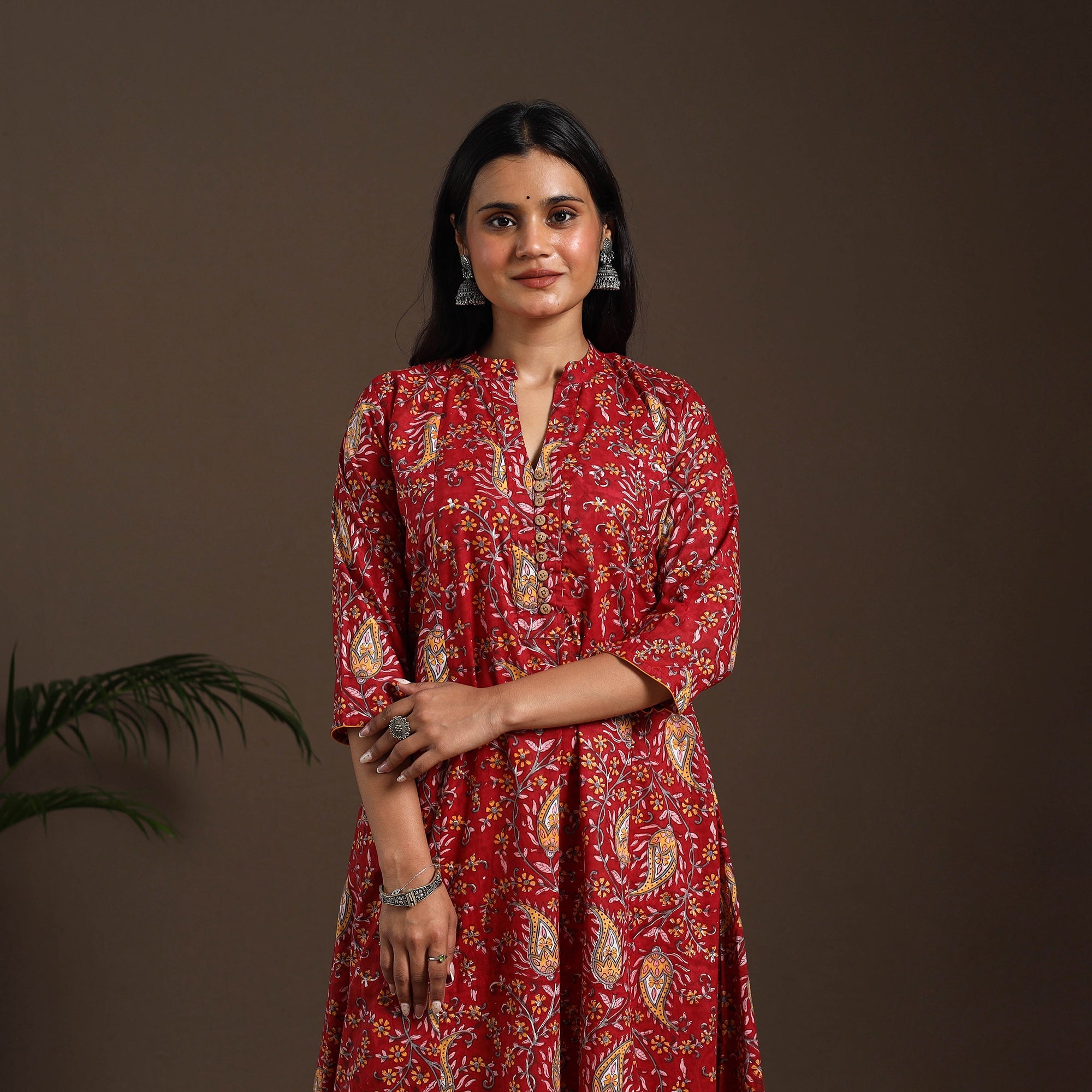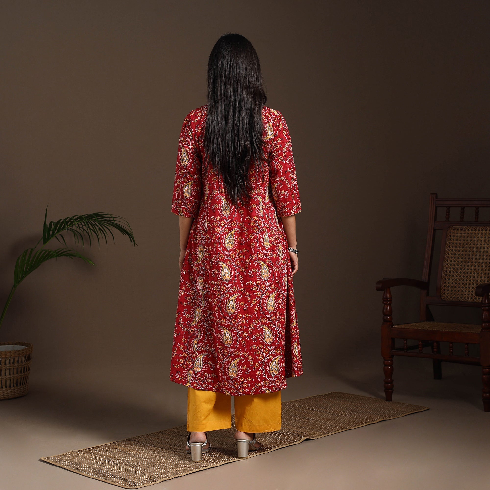 This red sanganeri block-printed A-line kurta is crafted from breathable cotton. Featuring a handy side pocket and floral motifs made with traditional wooden blocks of Sanganer, it is perfect for daily wear, office looks, festive gatherings, or travel. The silhouette blends comfort with effortless elegance.