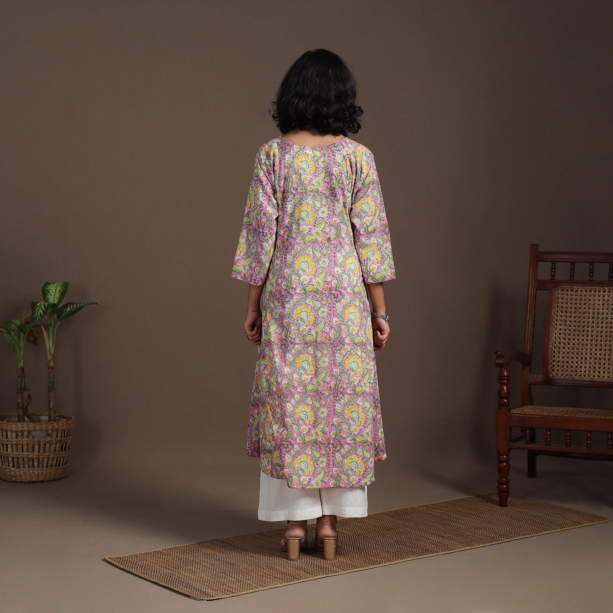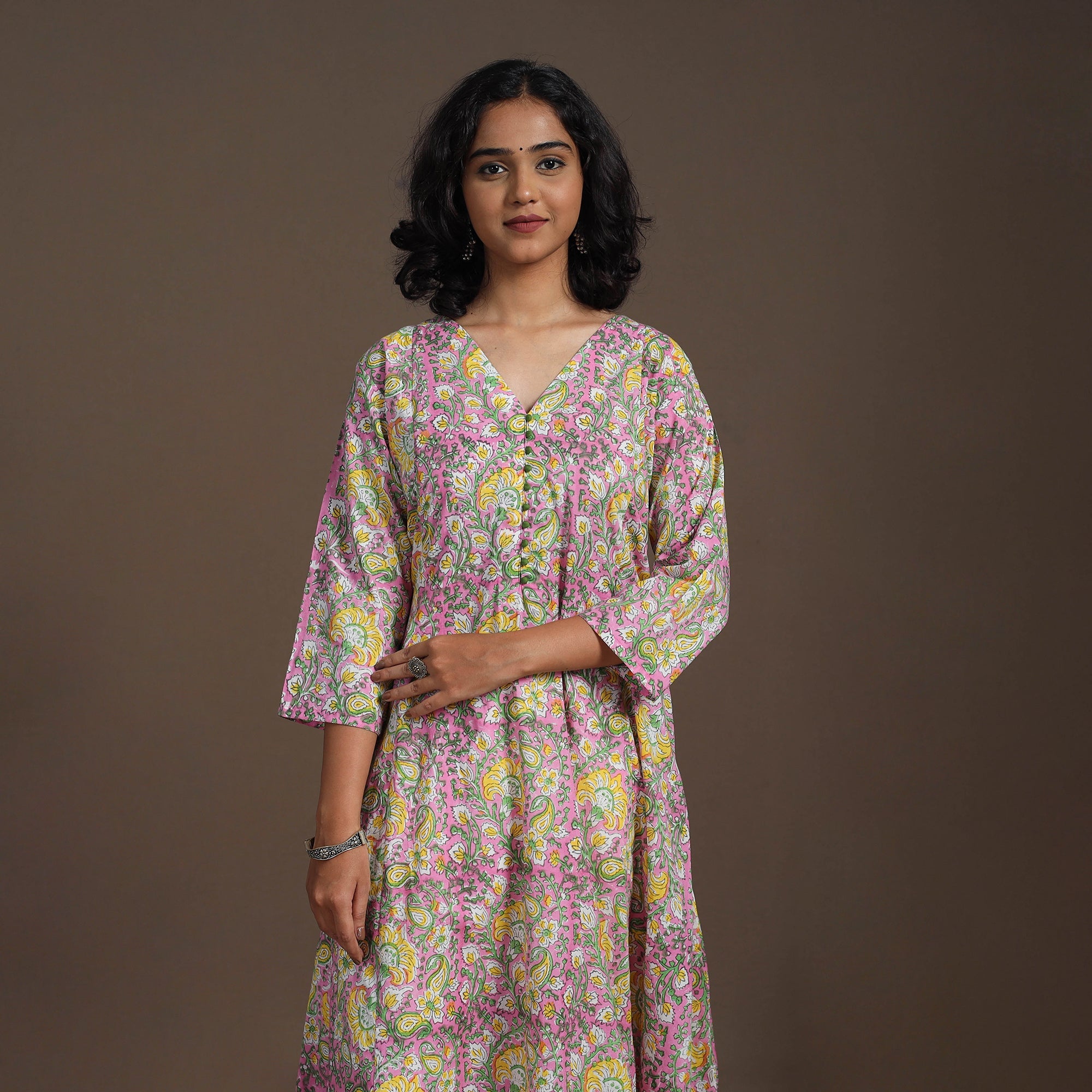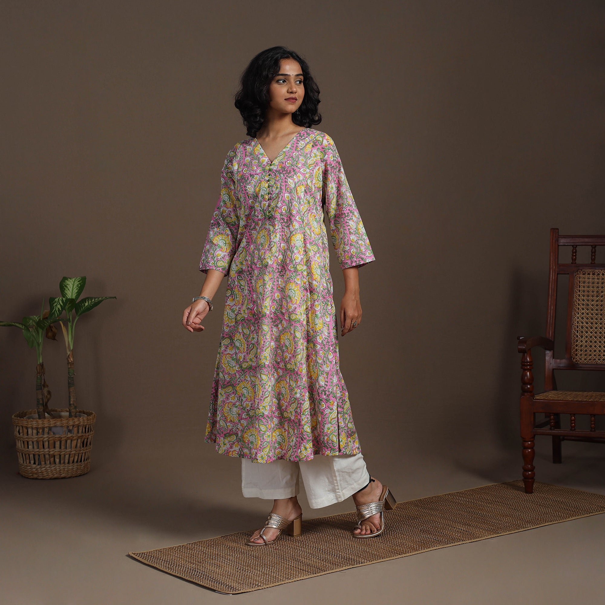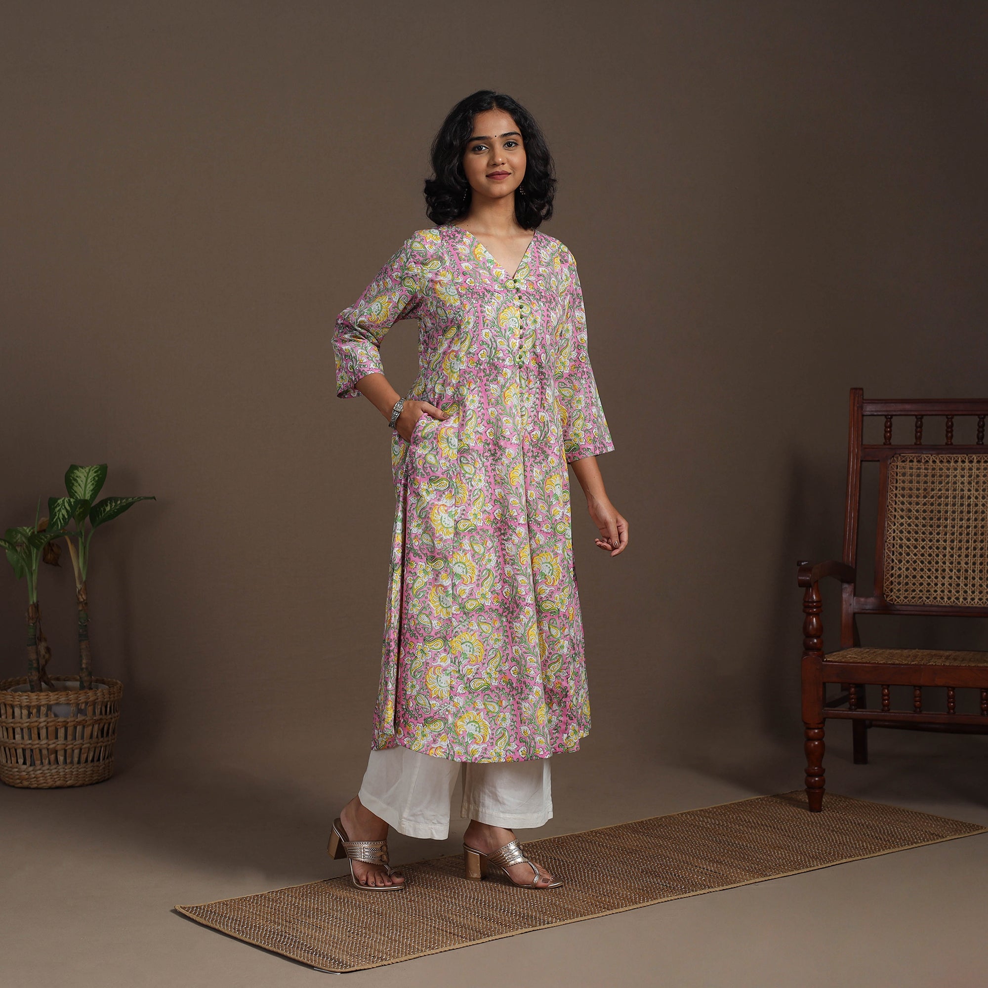 This a-line cotton kurta features intricate sanganeri block prints brought to life by skilled hands. The breathable fabric offers long-lasting comfort, and the delicate design adds subtle charm. With a side pocket and a flowy silhouette, it suits everything from brunch dates to festive evenings.