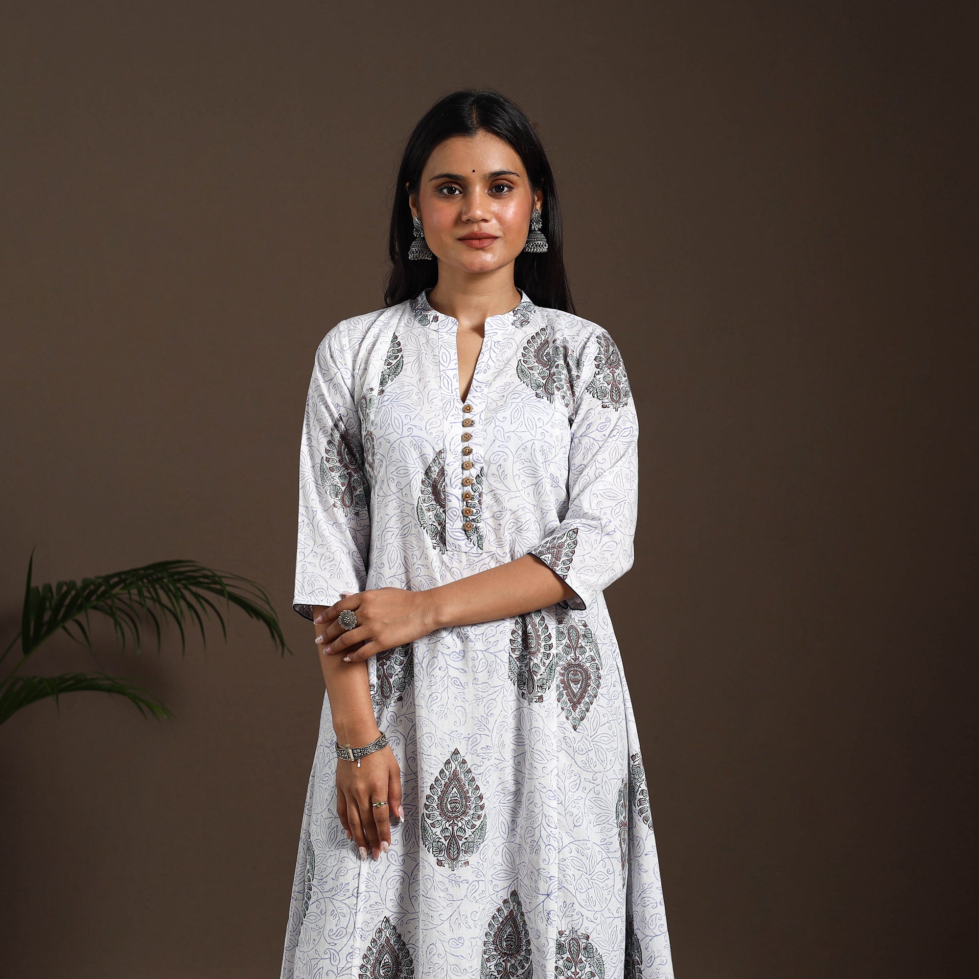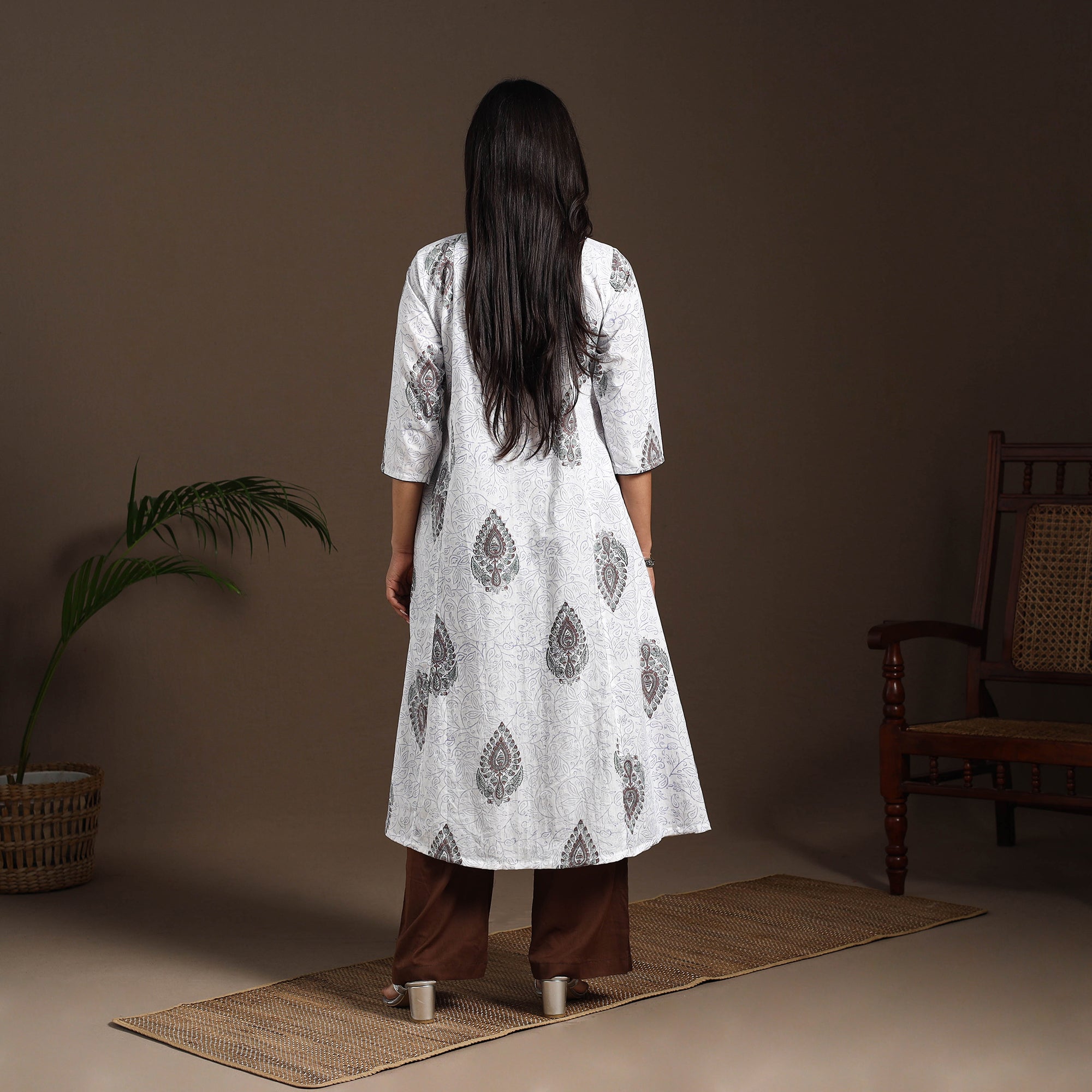 This white sanganeri block-printed A-line kurta is crafted from breathable cotton. Featuring a handy side pocket and floral motifs made with traditional wooden blocks of Sanganer, it is perfect for daily wear, office looks, festive gatherings, or travel. The silhouette blends comfort with effortless elegance.