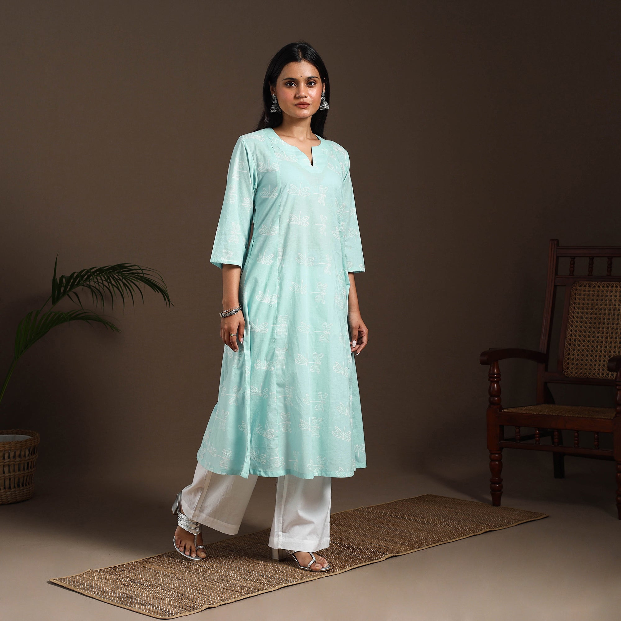 This blue sanganeri block-printed A-line kurta is crafted from breathable cotton. Featuring a handy side pocket and floral motifs made with traditional wooden blocks of Sanganer, it is perfect for daily wear, office looks, festive gatherings, or travel. The silhouette blends comfort with effortless elegance.