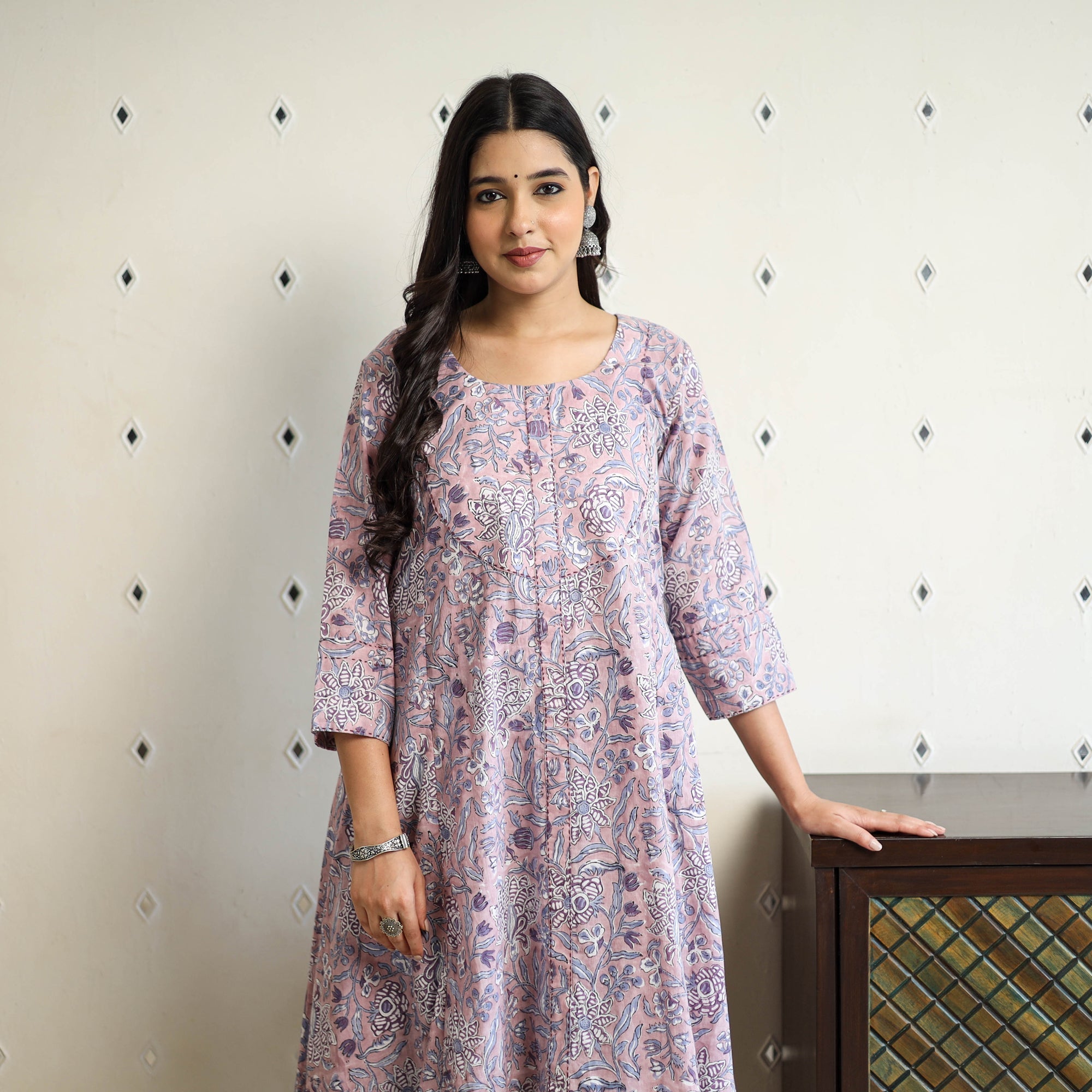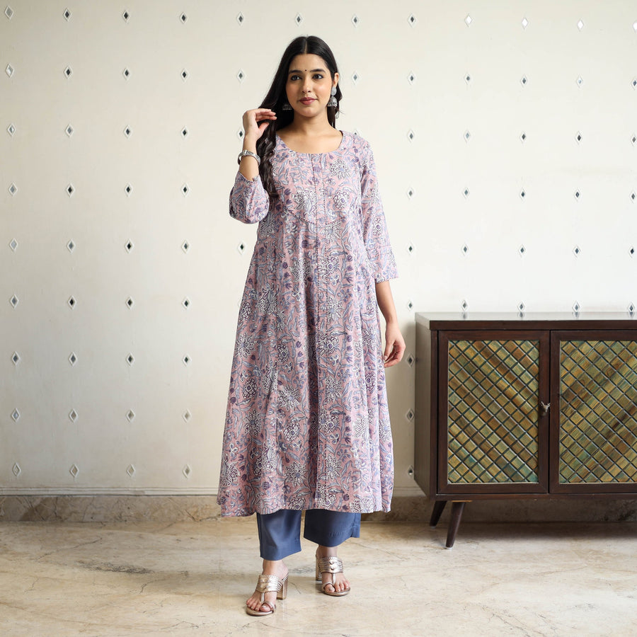This purple sanganeri block-printed A-line kurta is crafted from breathable cotton and beautifully adorned with hand embroidery. It includes a functional side pocket for convenience. The floral motifs are printed using traditional wooden blocks, showcasing the authentic block printing native to Sanganer. Perfect for both casual outings and festive occasions.