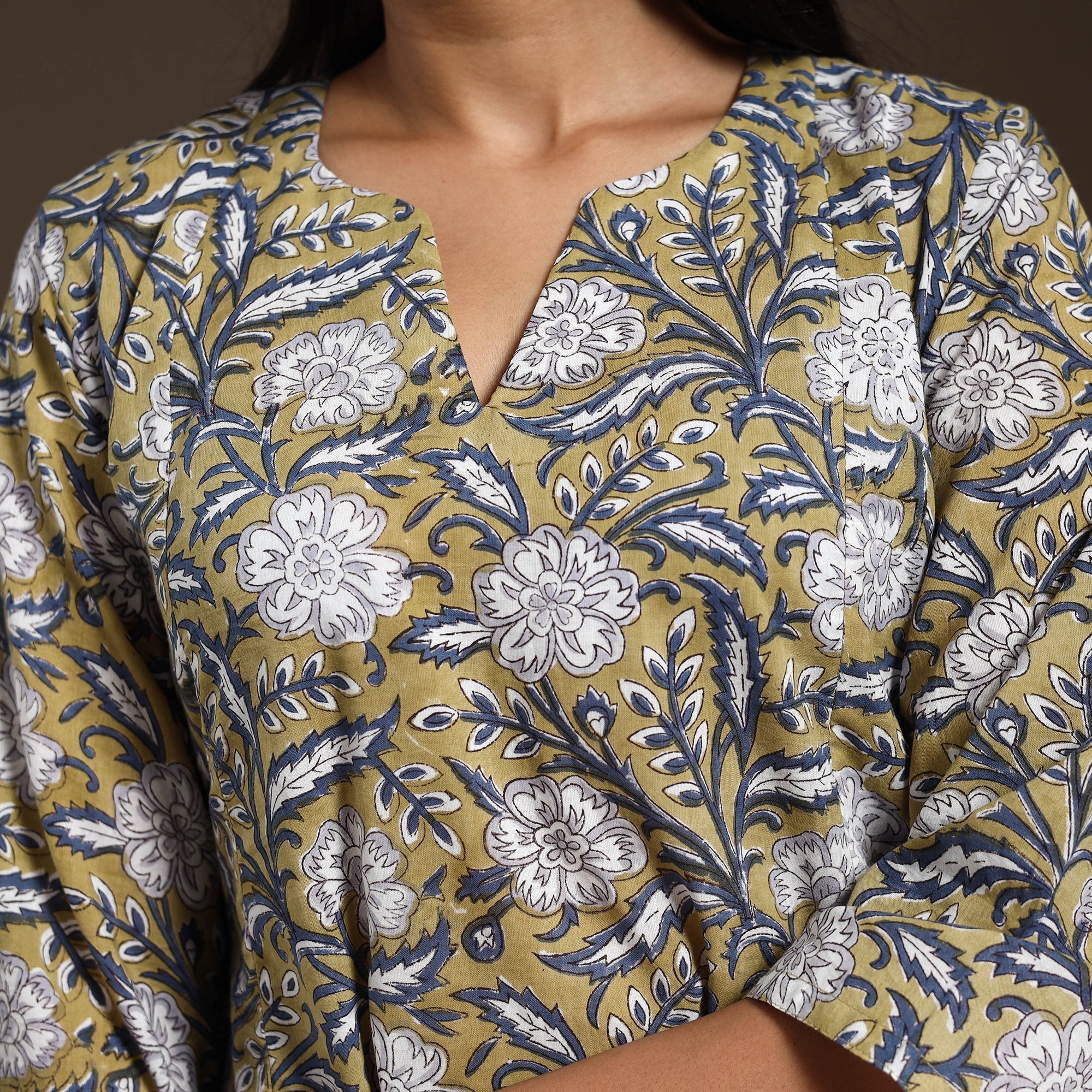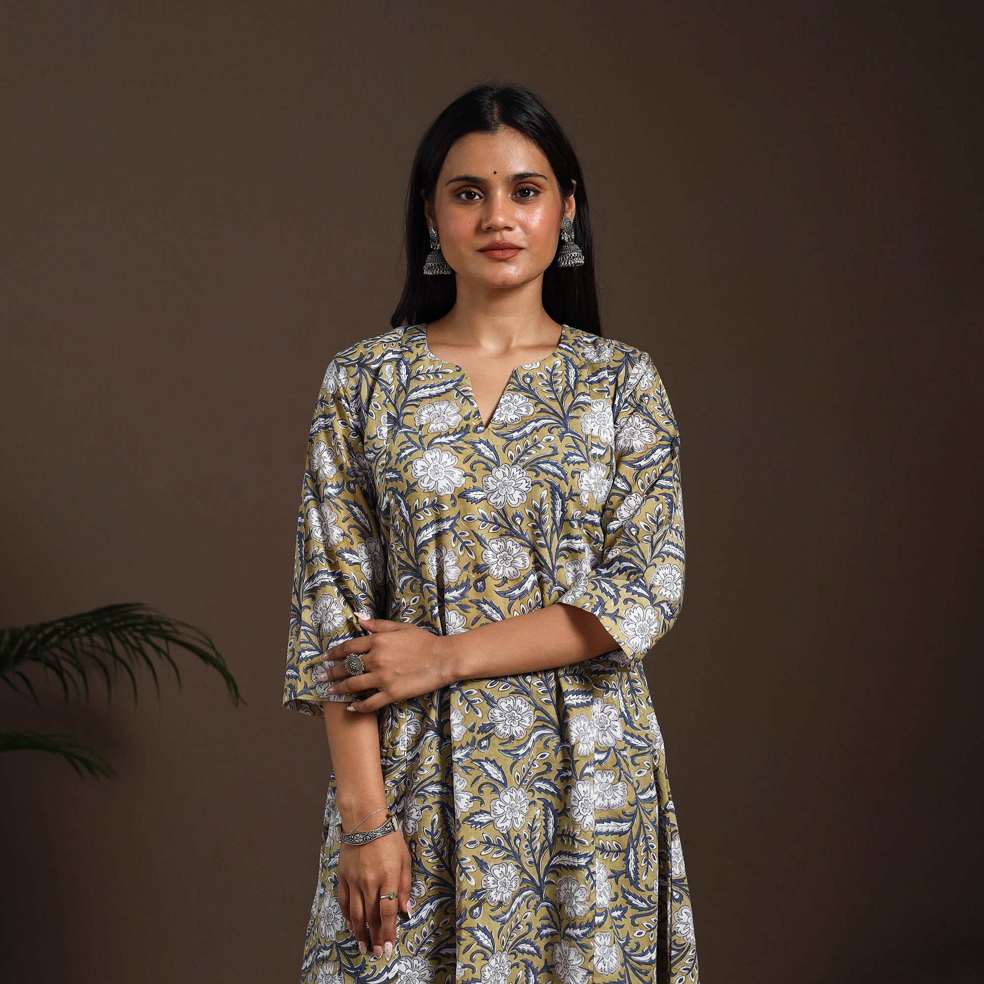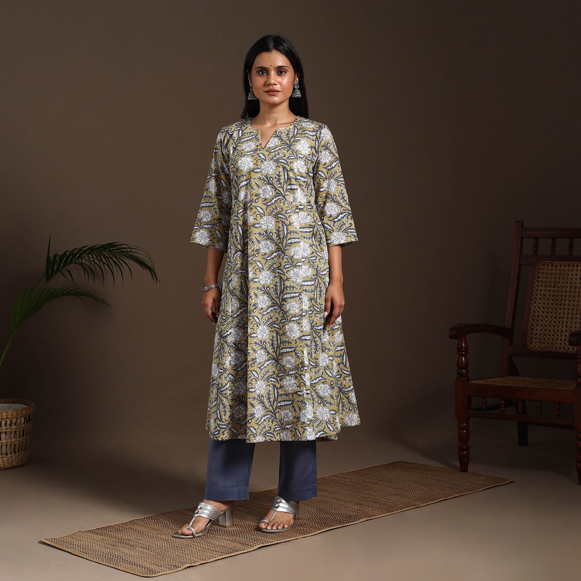 This yellow sanganeri block-printed A-line kurta is crafted from breathable cotton. Featuring a handy side pocket and floral motifs made with traditional wooden blocks of Sanganer, it is perfect for daily wear, office looks, festive gatherings, or travel. The silhouette blends comfort with effortless elegance.
