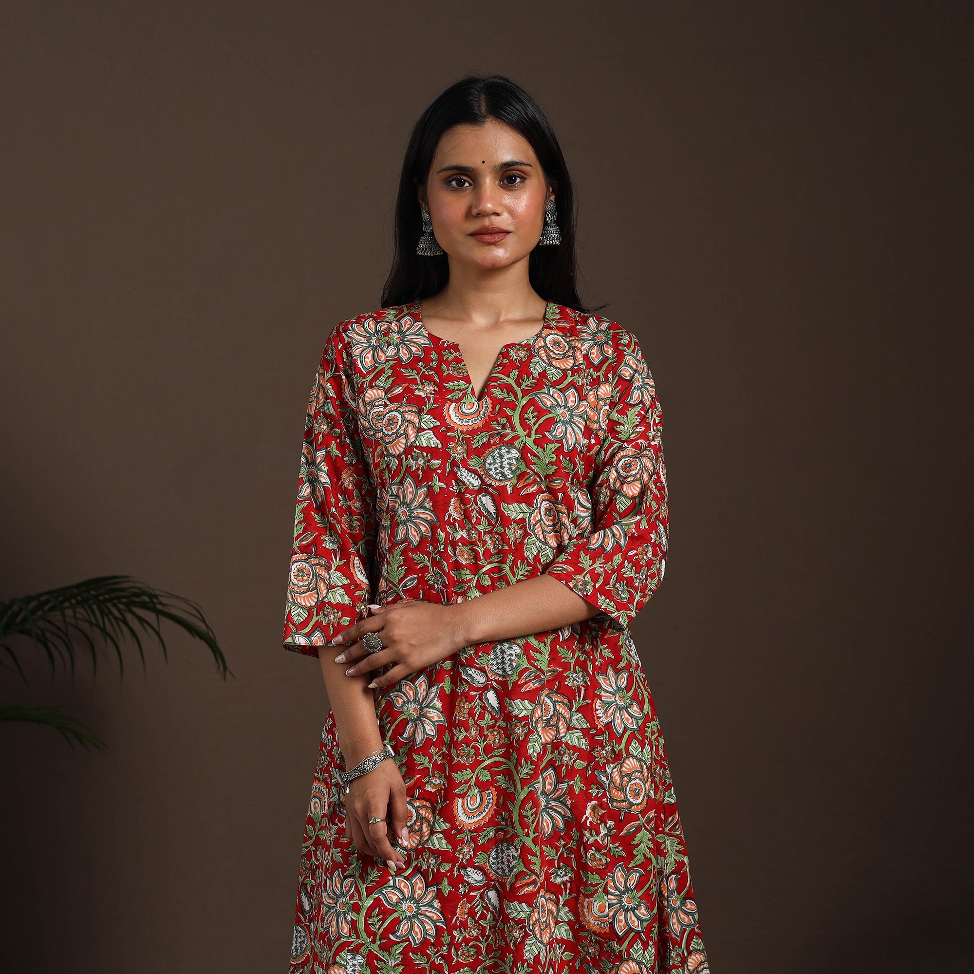This red sanganeri block-printed A-line kurta is crafted from breathable cotton. Featuring a handy side pocket and floral motifs made with traditional wooden blocks of Sanganer, it is perfect for daily wear, office looks, festive gatherings, or travel. The silhouette blends comfort with effortless elegance.