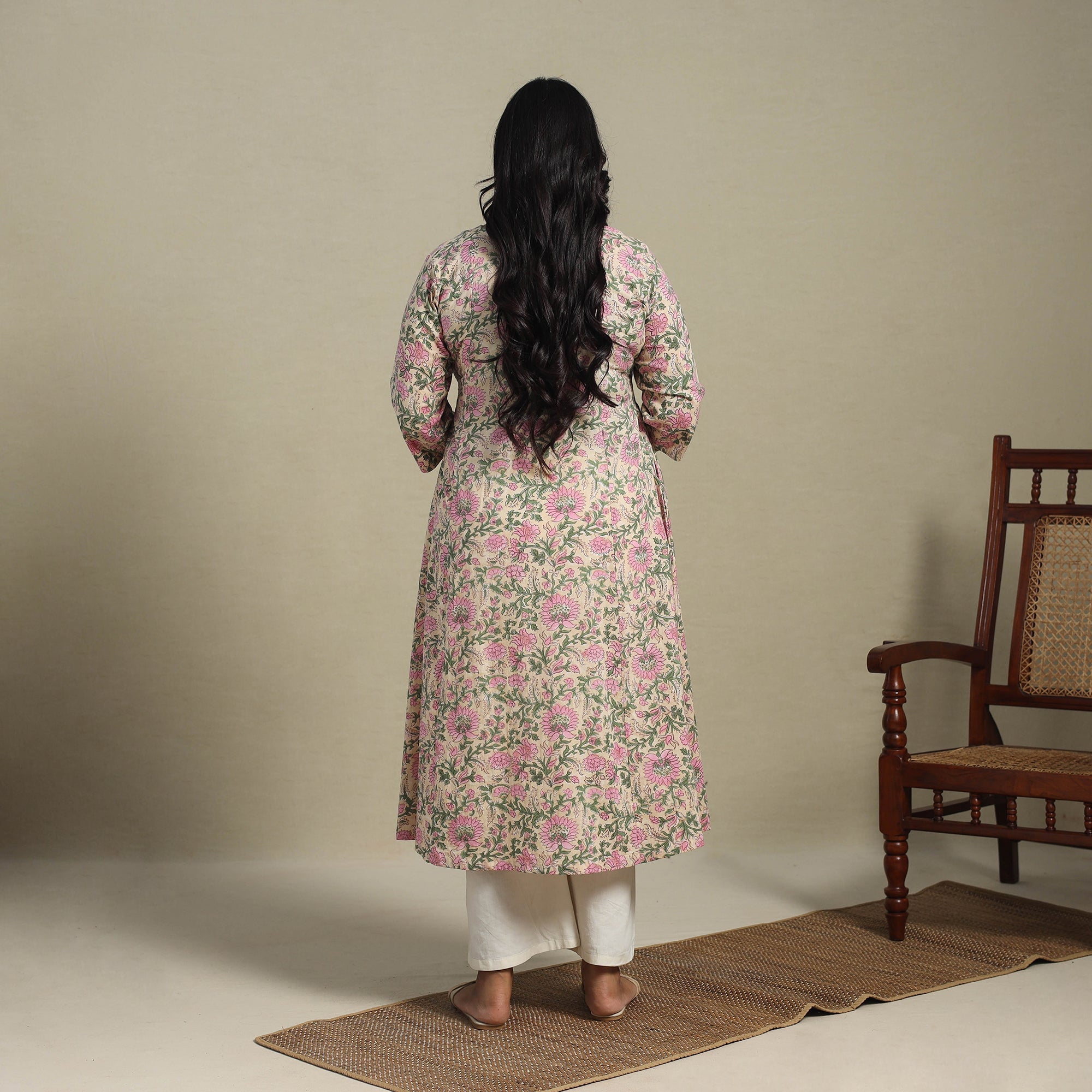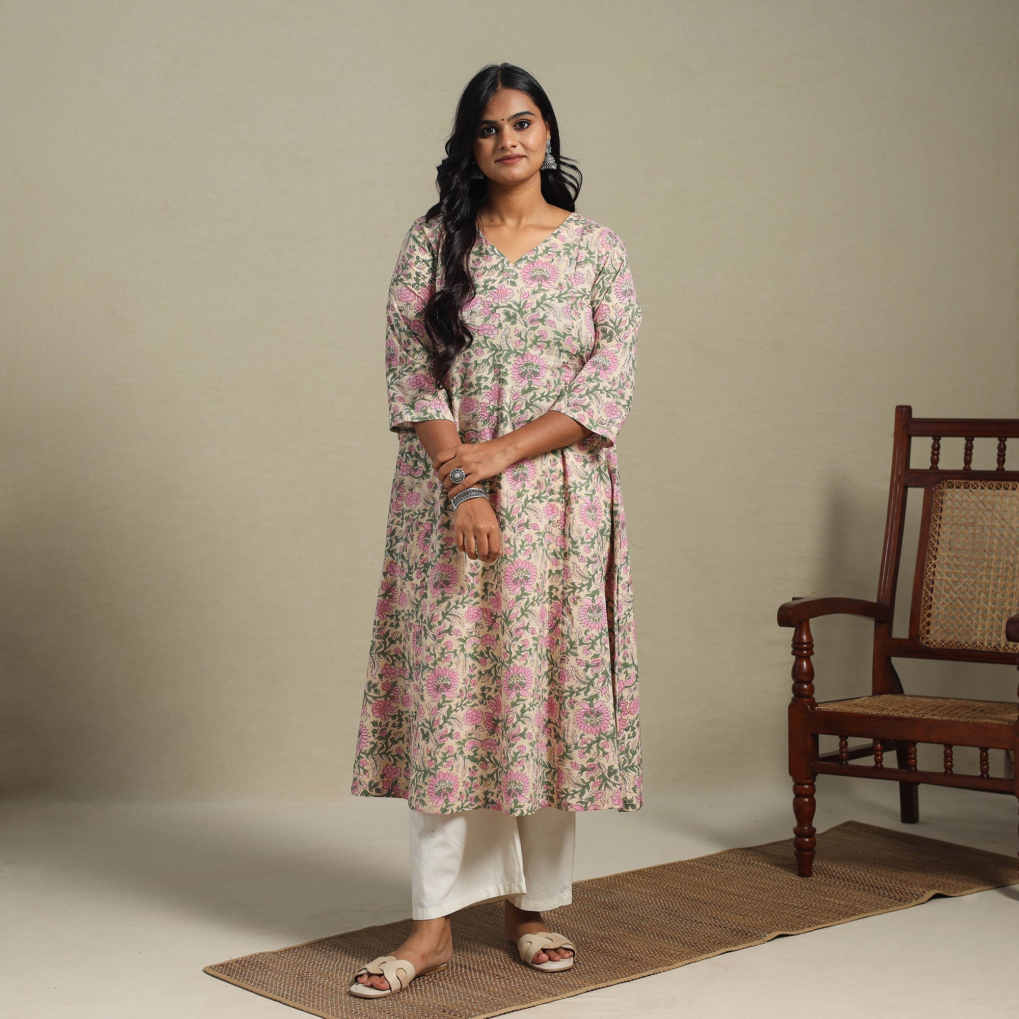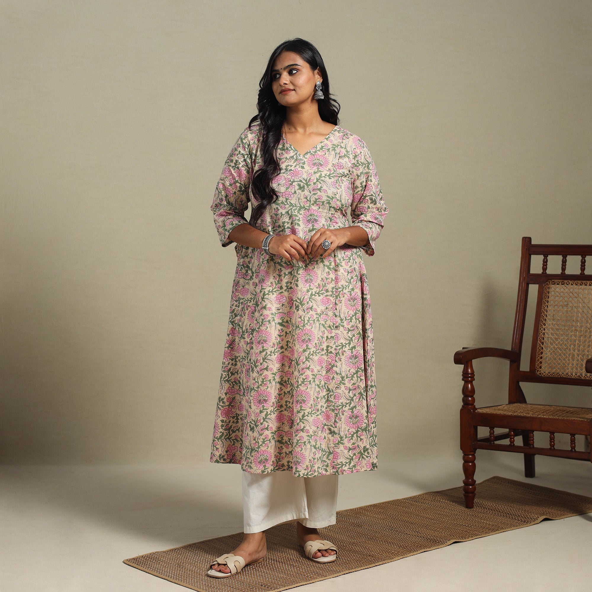 This peach A-line cotton kurta features intricate sanganeri block prints brought to life by skilled hands. The breathable fabric offers long-lasting comfort, and the delicate design adds subtle charm. With a side pocket and a flowy silhouette, it suits everything from brunch dates to festive evenings.