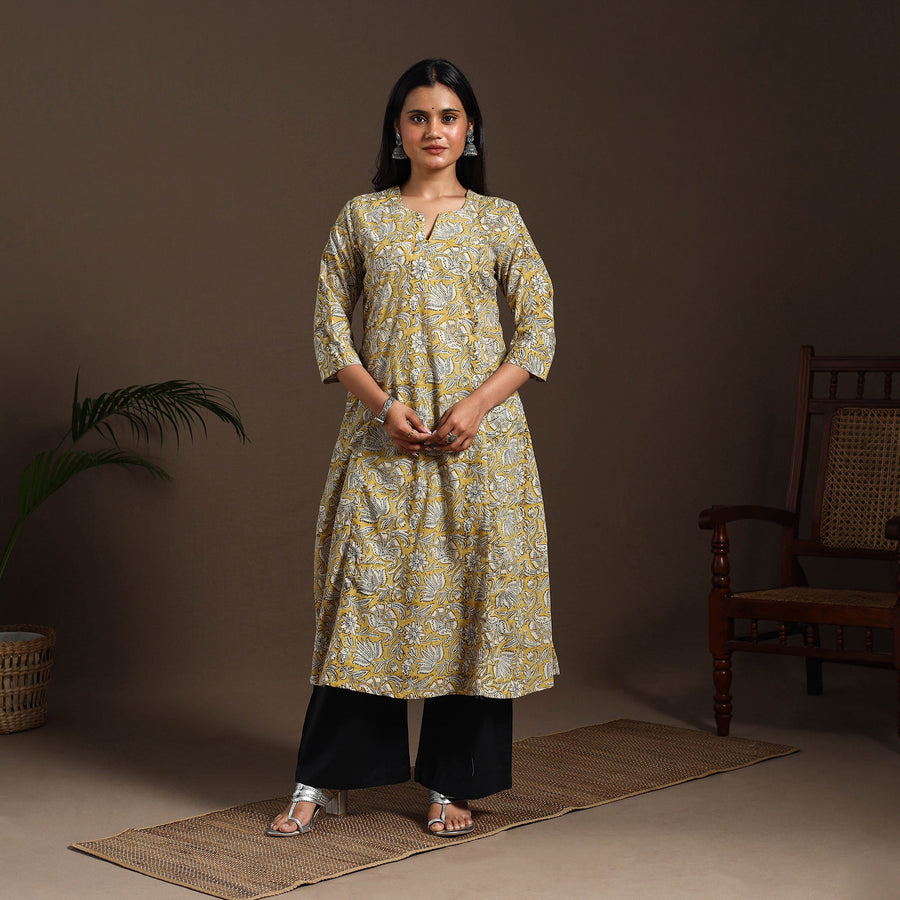 This yellow sanganeri block-printed A-line kurta is crafted from breathable cotton. Featuring a handy side pocket and floral motifs made with traditional wooden blocks of Sanganer, it is perfect for daily wear, office looks, festive gatherings, or travel. The silhouette blends comfort with effortless elegance.