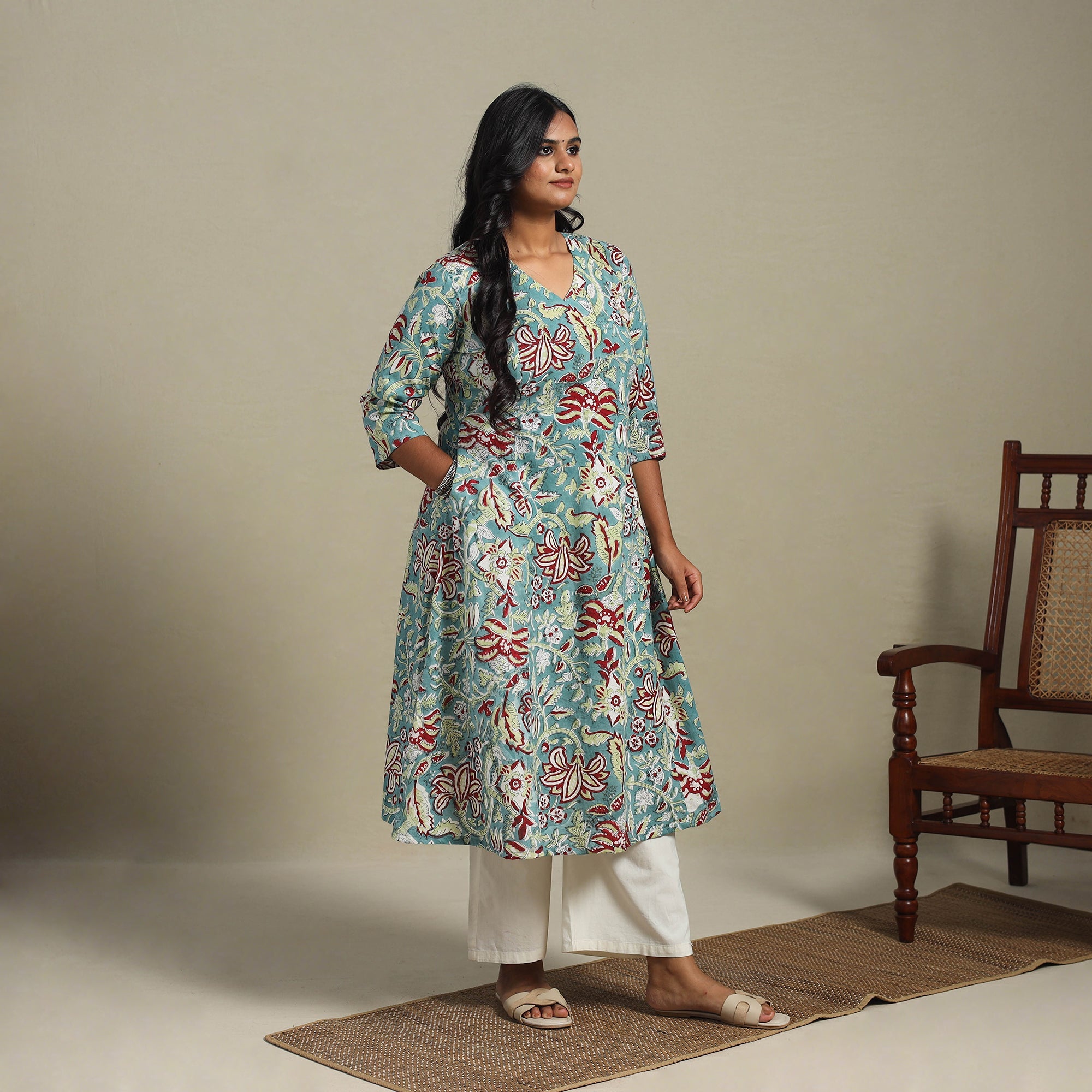 This blue A-line cotton kurta features intricate sanganeri block prints brought to life by skilled hands. The breathable fabric offers long-lasting comfort, and the delicate design adds subtle charm. With a side pocket and a flowy silhouette, it suits everything from brunch dates to festive evenings.