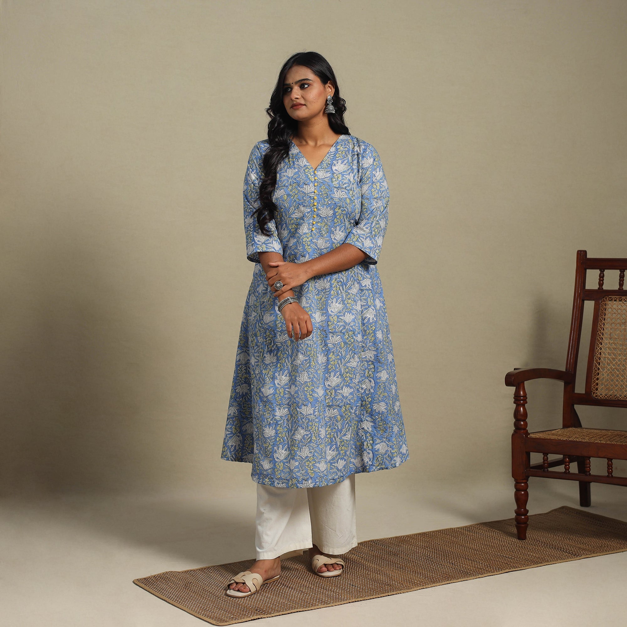 This blue A-line cotton kurta features intricate sanganeri block prints brought to life by skilled hands. The breathable fabric offers long-lasting comfort, and the delicate design adds subtle charm. With a side pocket and a flowy silhouette, it suits everything from brunch dates to festive evenings.