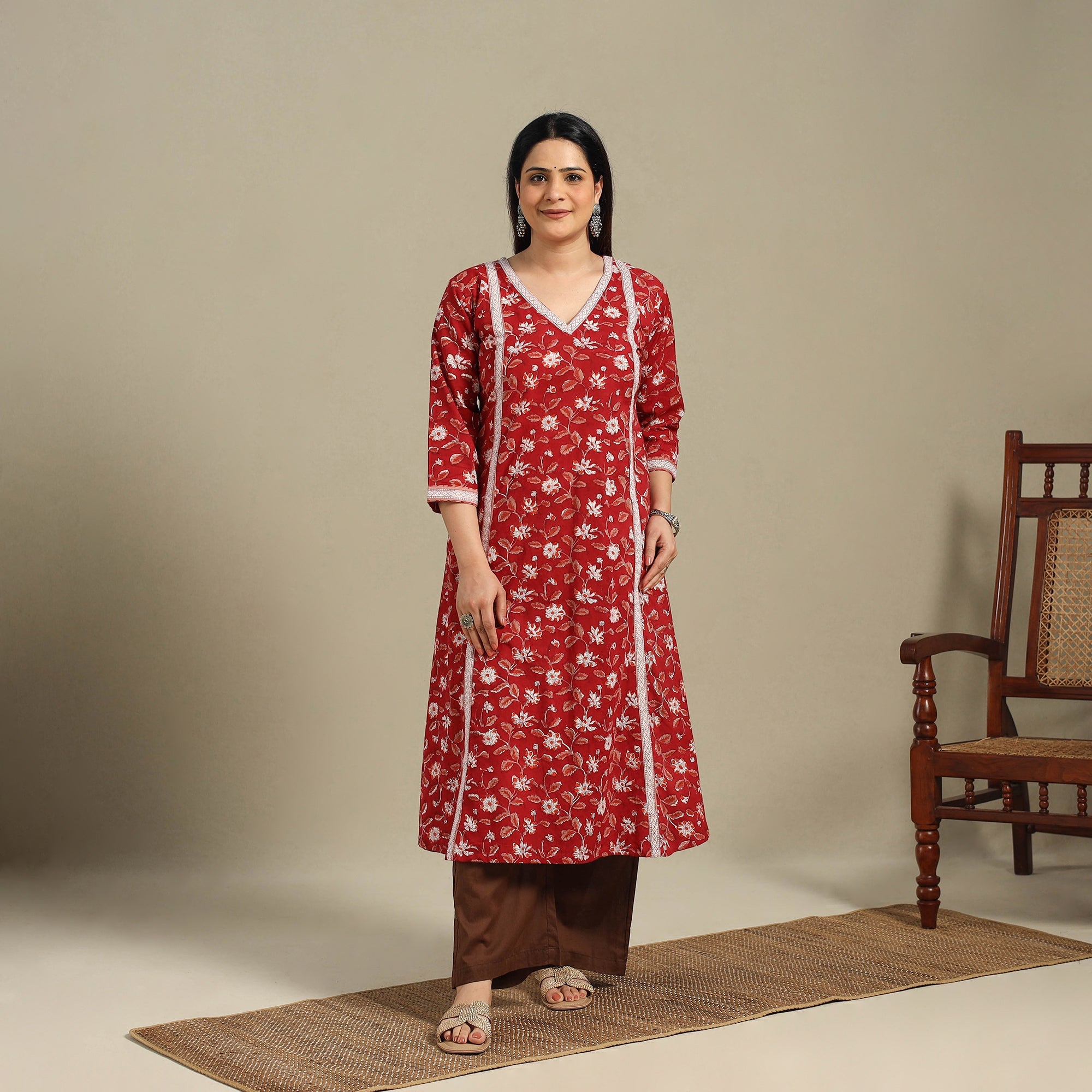 This red sanganeri block-printed A-line kurta is made from soft, breathable cotton. It features a side pocket and floral motifs crafted using traditional wooden blocks from Sanganer. Ideal for daily wear, office outfits, festive occasions, or travel, this silhouette offers a seamless blend of comfort and effortless charm.