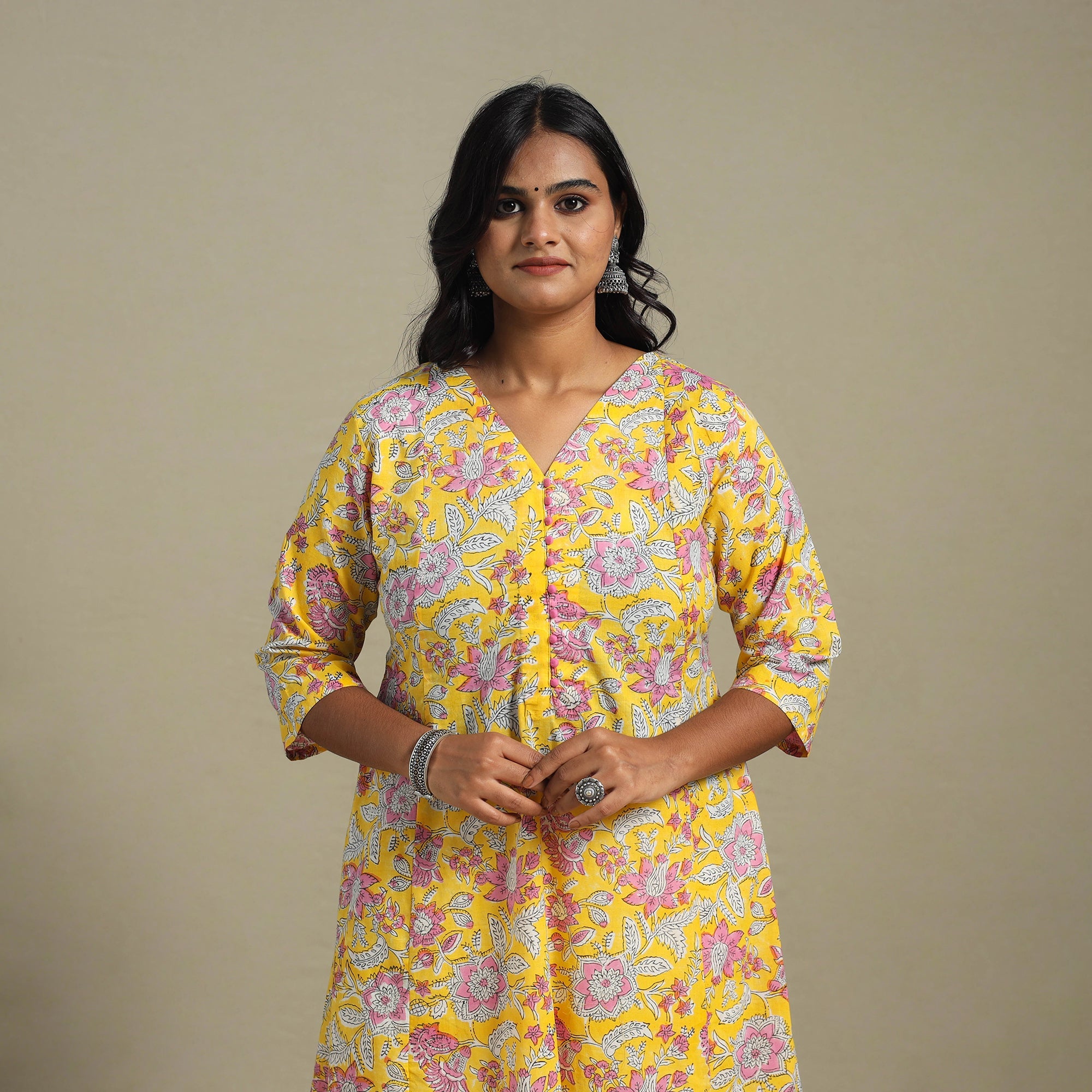 This yellow A-line cotton kurta features intricate sanganeri block prints brought to life by skilled hands. The breathable fabric offers long-lasting comfort, and the delicate design adds subtle charm. With a side pocket and a flowy silhouette, it suits everything from brunch dates to festive evenings.