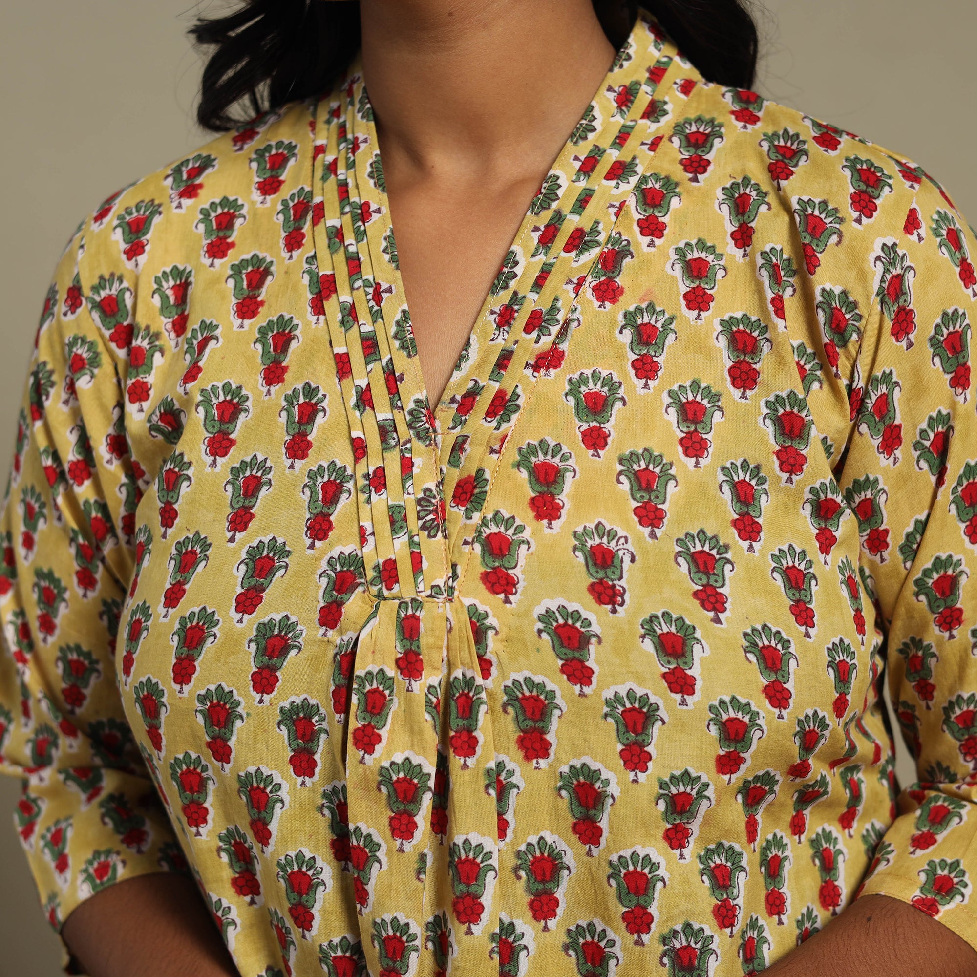 This yellow A-line cotton kurta features intricate sanganeri block prints brought to life by skilled hands. The breathable fabric offers long-lasting comfort, and the delicate design adds subtle charm. With a side pocket and a flowy silhouette, it suits everything from brunch dates to festive evenings.