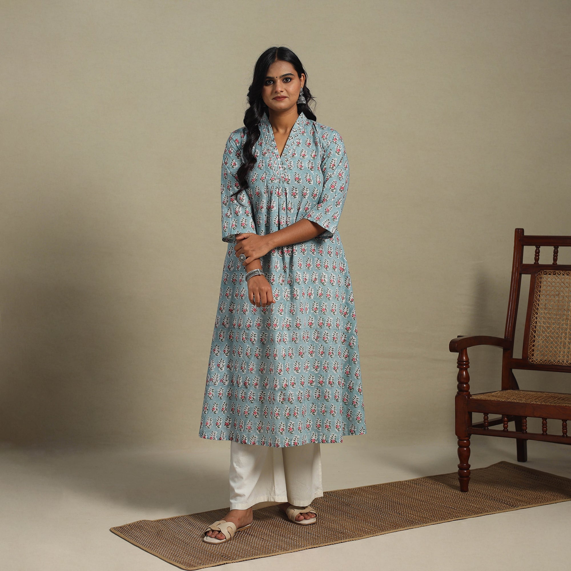 This blue A-line cotton kurta features intricate sanganeri block prints brought to life by skilled hands. The breathable fabric offers long-lasting comfort, and the delicate design adds subtle charm. With a side pocket and a flowy silhouette, it suits everything from brunch dates to festive evenings.