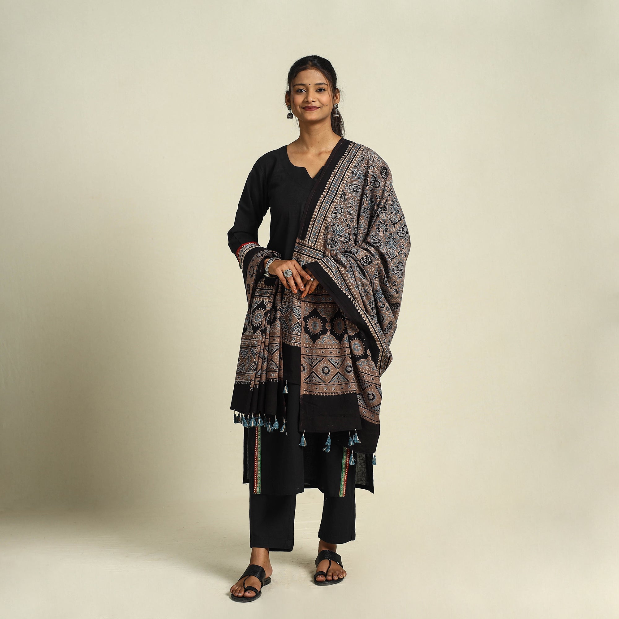 Drape yourself in the timeless charm of this brown ajrakh dupatta, crafted by skilled artisans of Kutch, Gujarat. Made from soft and breathable cotton, its finished with delicate tassels, it features traditional ajrakh block printing done using natural dyes and hand-carved wooden blocks. Each design reflects centuries of cultural heritage and its enduring beauty.