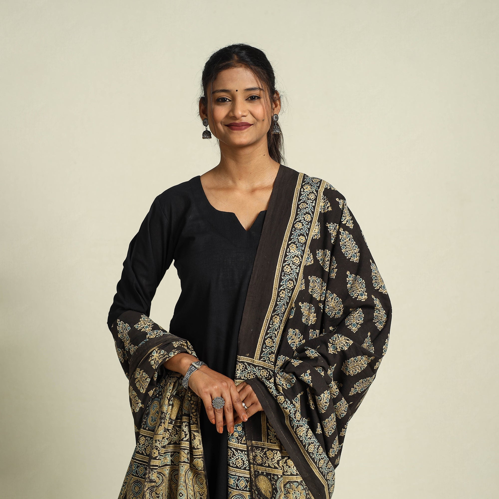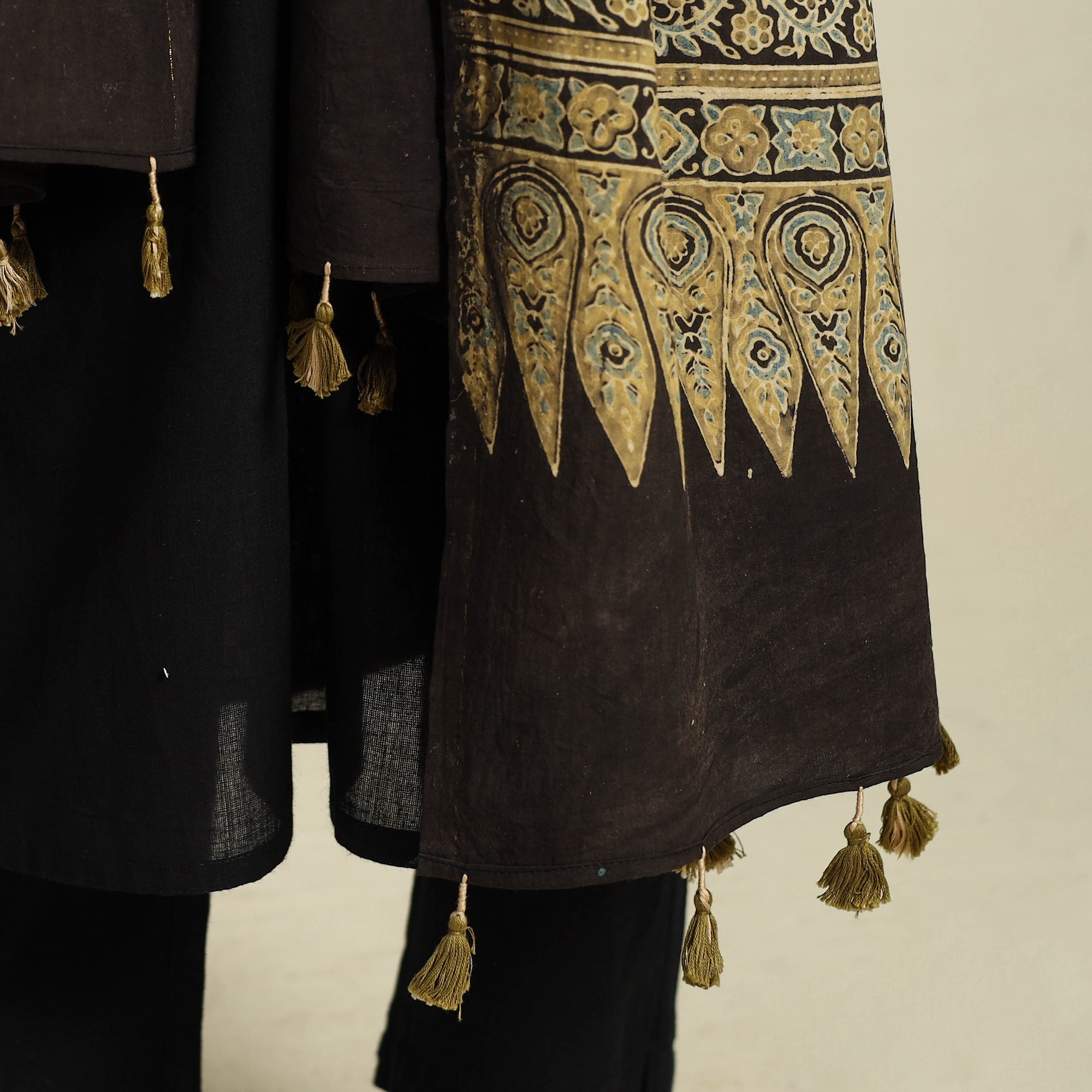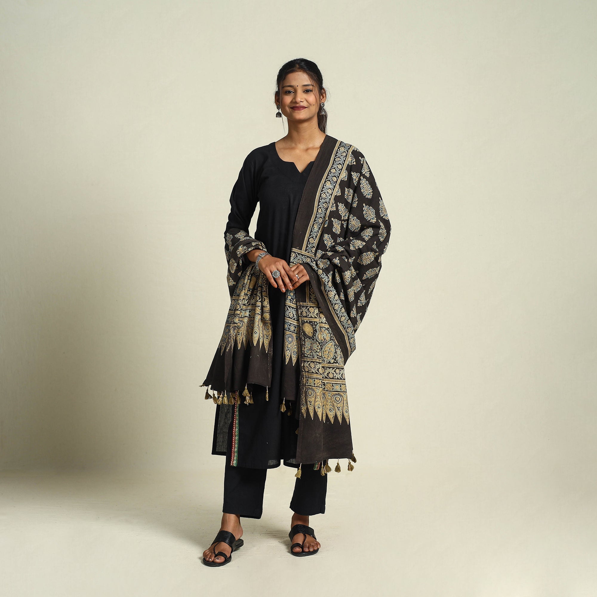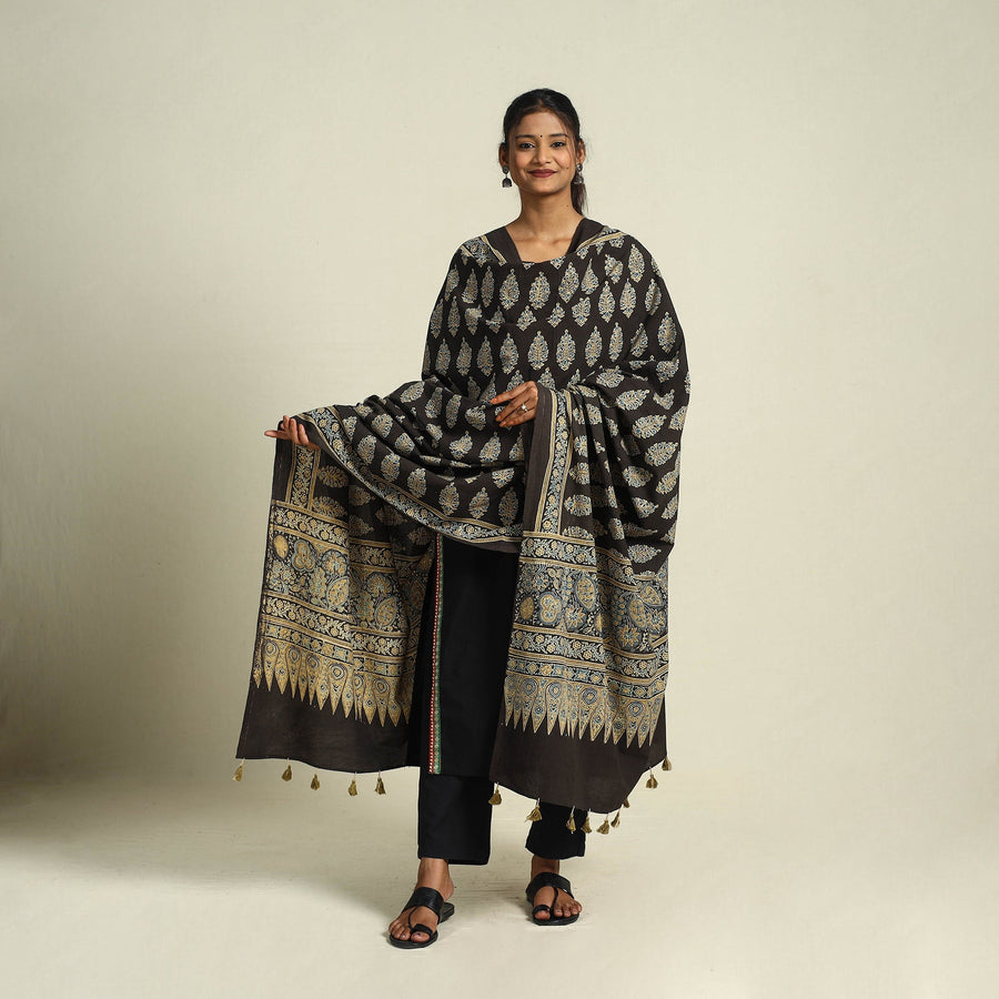 Drape yourself in the timeless charm of this black ajrakh dupatta, crafted by skilled artisans of Kutch, Gujarat. Made from soft and breathable cotton, its finished with delicate tassels, it features traditional ajrakh block printing done using natural dyes and hand-carved wooden blocks. Each design reflects centuries of cultural heritage and its enduring beauty.