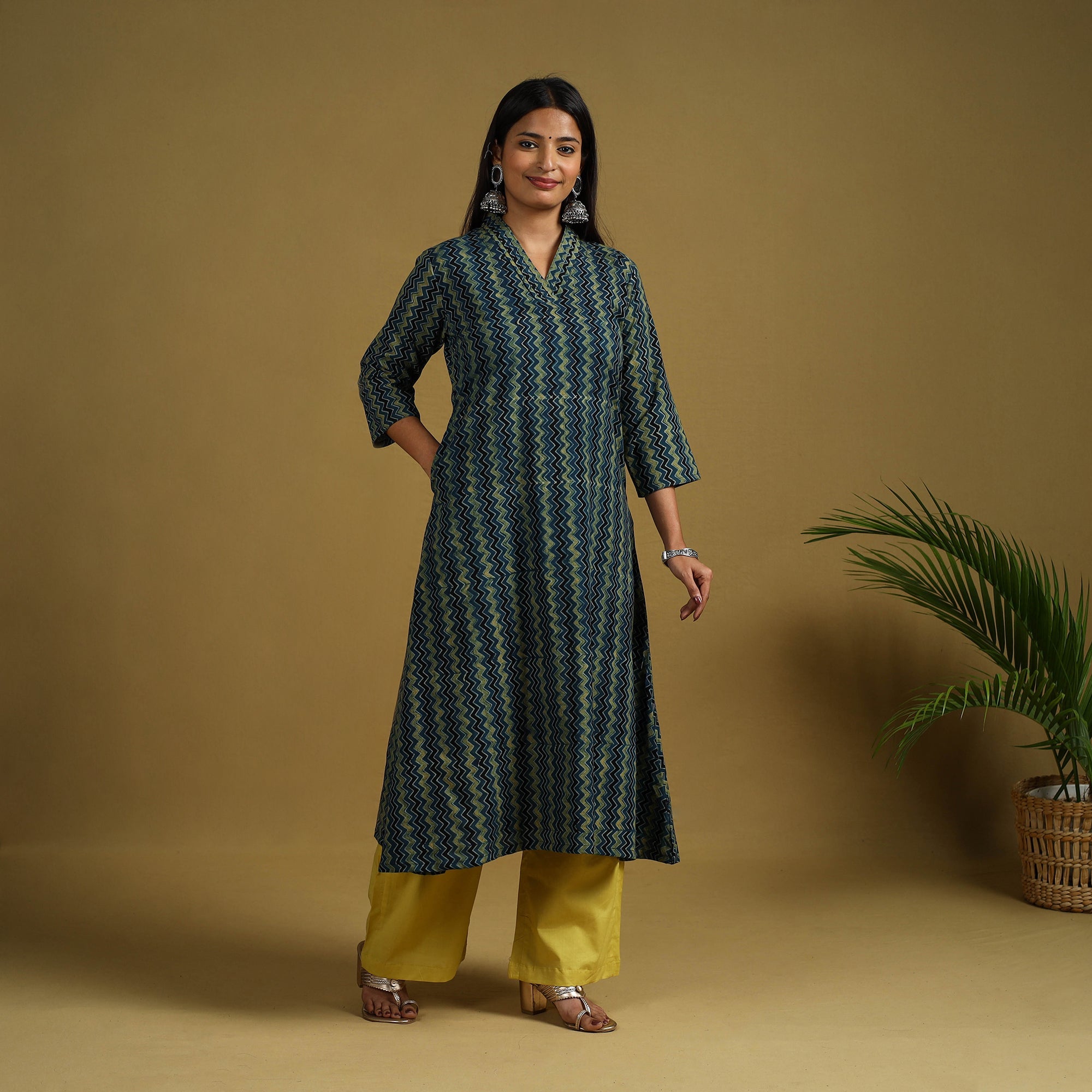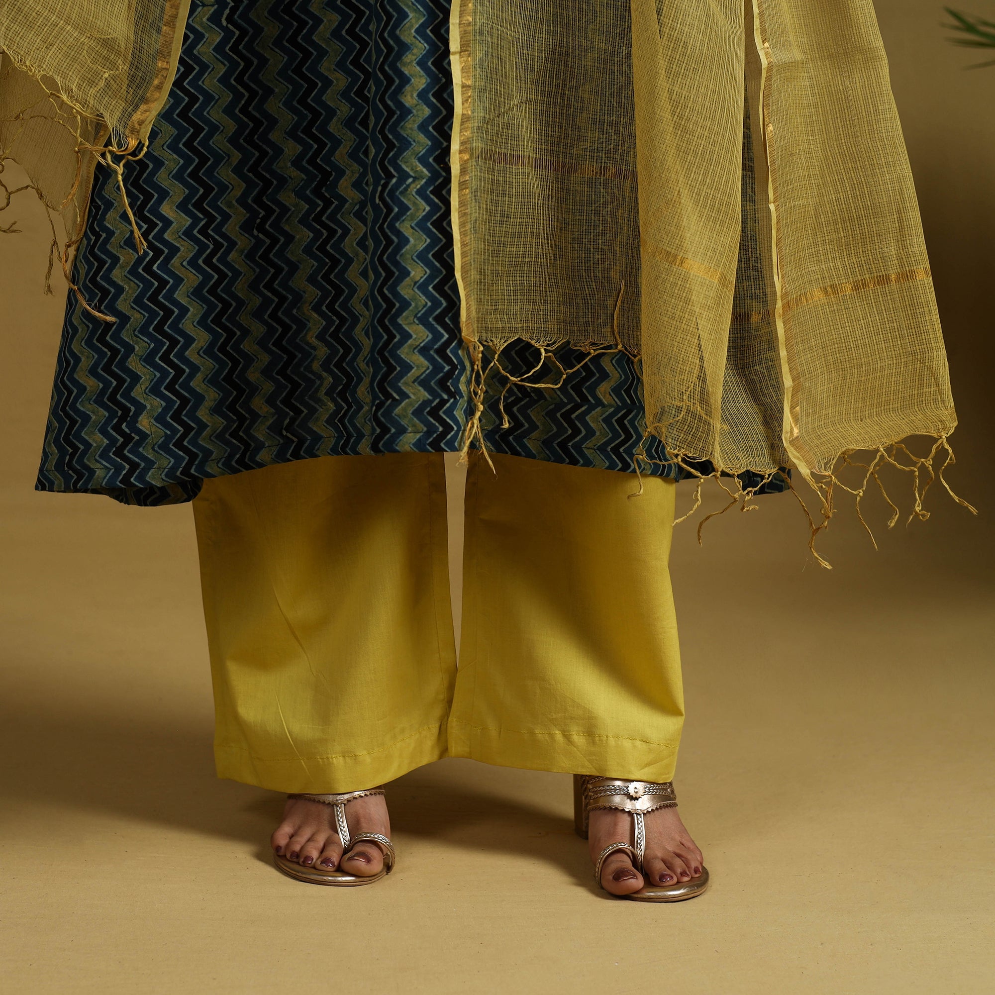 Embrace the beauty of ajrakh with this blue cotton kurta set, featuring a hand block printed A-line kurta, a comfortable palazzo, and a kota doria dupatta. Crafted using traditional natural dyeing techniques, the kurta includes a convenient one-side pocket, and the palazzo has two side pockets. Soft, breathable, and stylish, this set is perfect for both casual days and festive occasions.