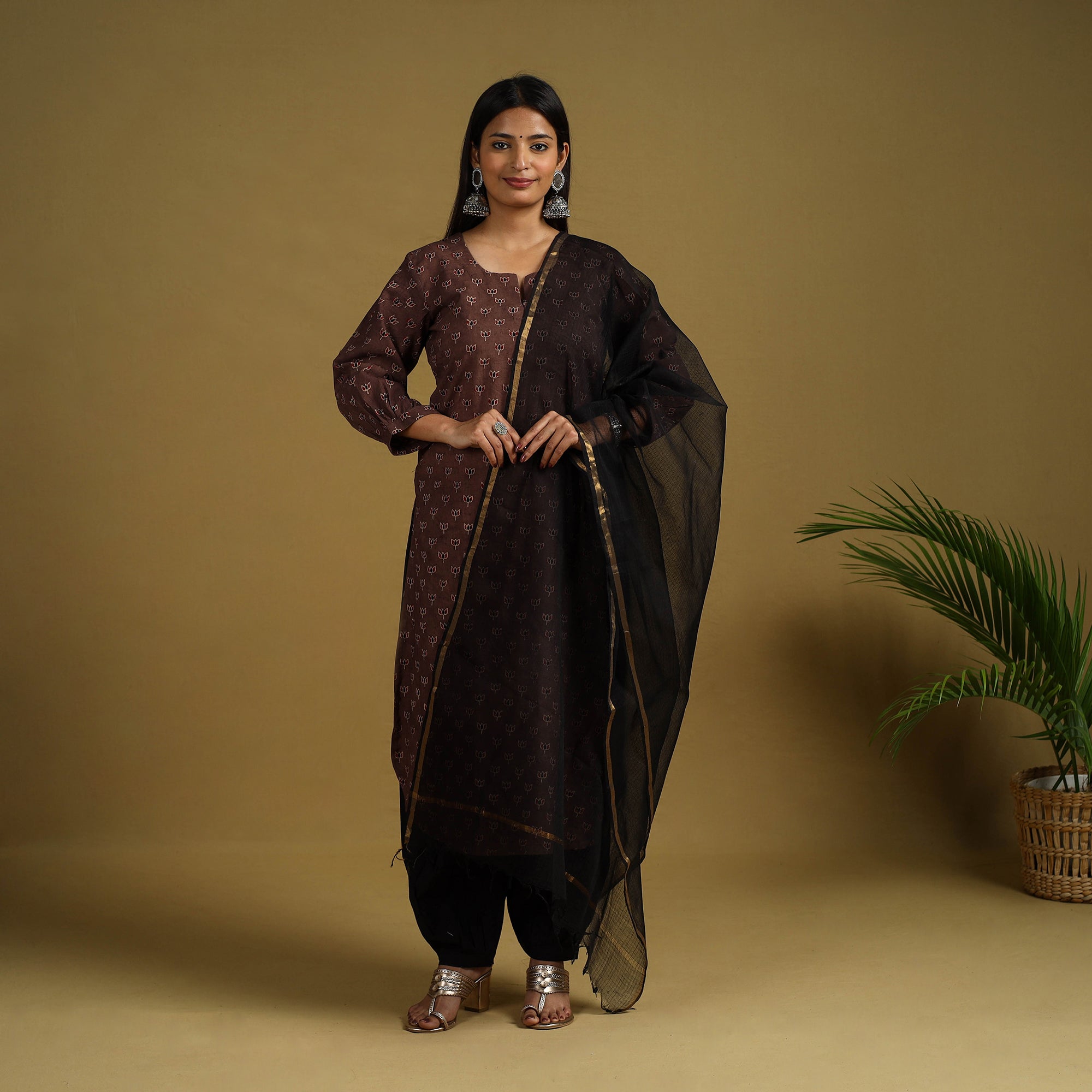 Step into the world of ajrakh with this brown hand block printed cotton kurta set, complete with a straight kurta, a relaxed salwar, and a light-weight kota doria dupatta. Crafted using traditional natural dyes, the kurta includes a one-side pocket. Designed for breathable comfort, this ensemble is perfect for casual outings as well as festive occasions.