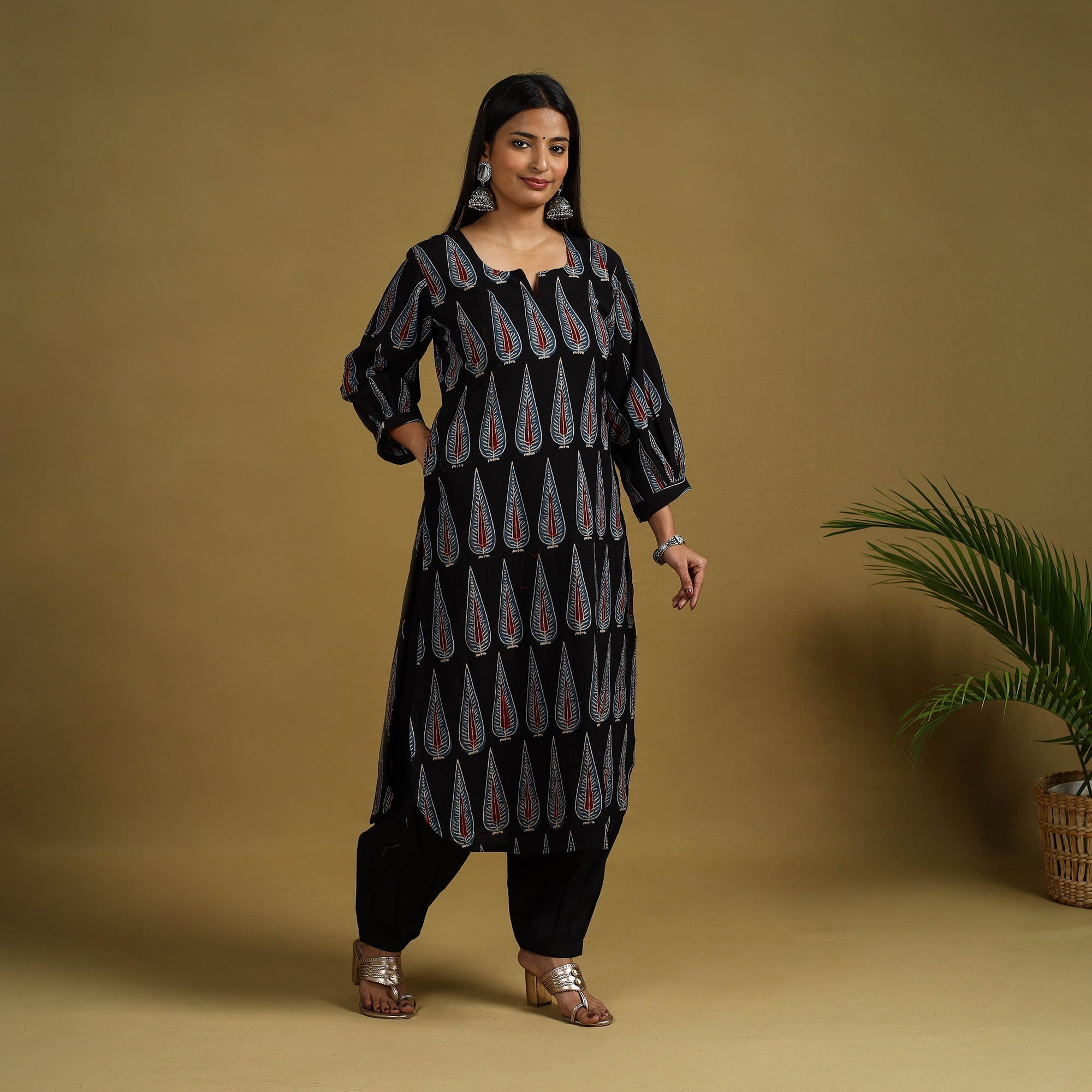 Step into the world of ajrakh with this black hand block printed cotton kurta set, complete with a straight kurta, a relaxed salwar, and a light-weight kota doria dupatta. Crafted using traditional natural dyes, the kurta includes a one-side pocket. Designed for breathable comfort, this ensemble is perfect for casual outings as well as festive occasions.