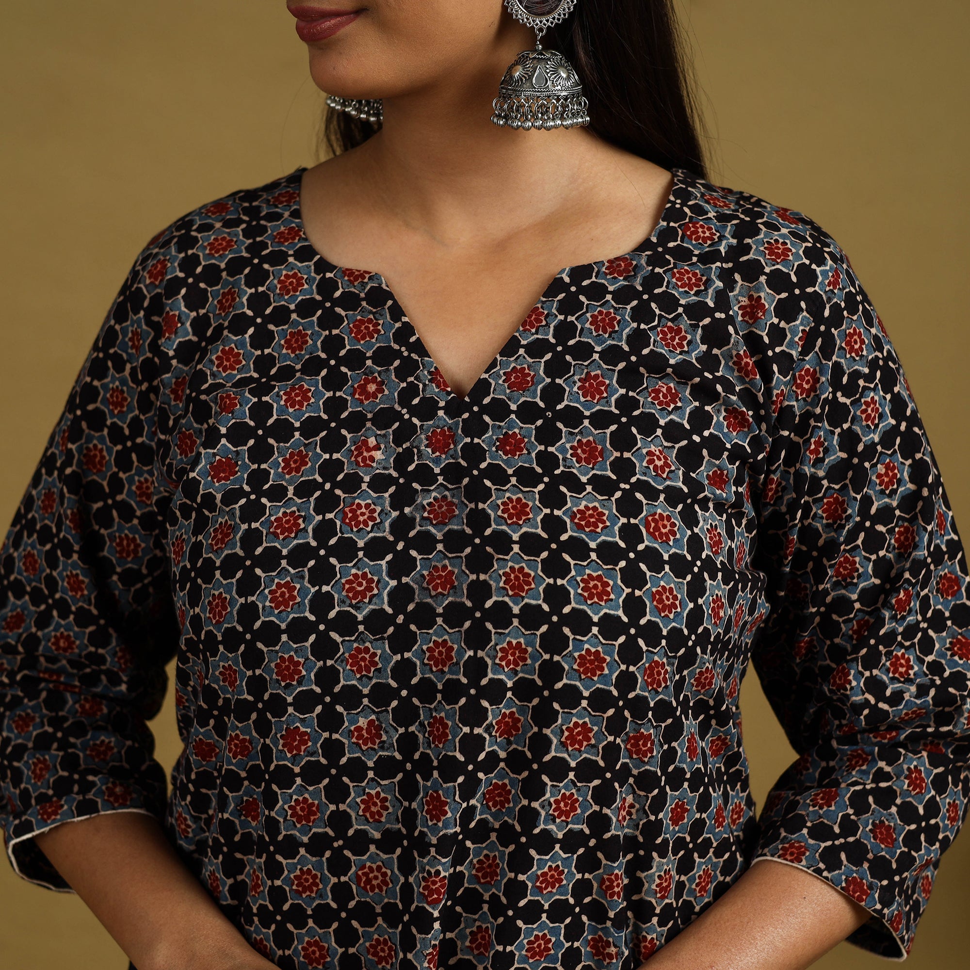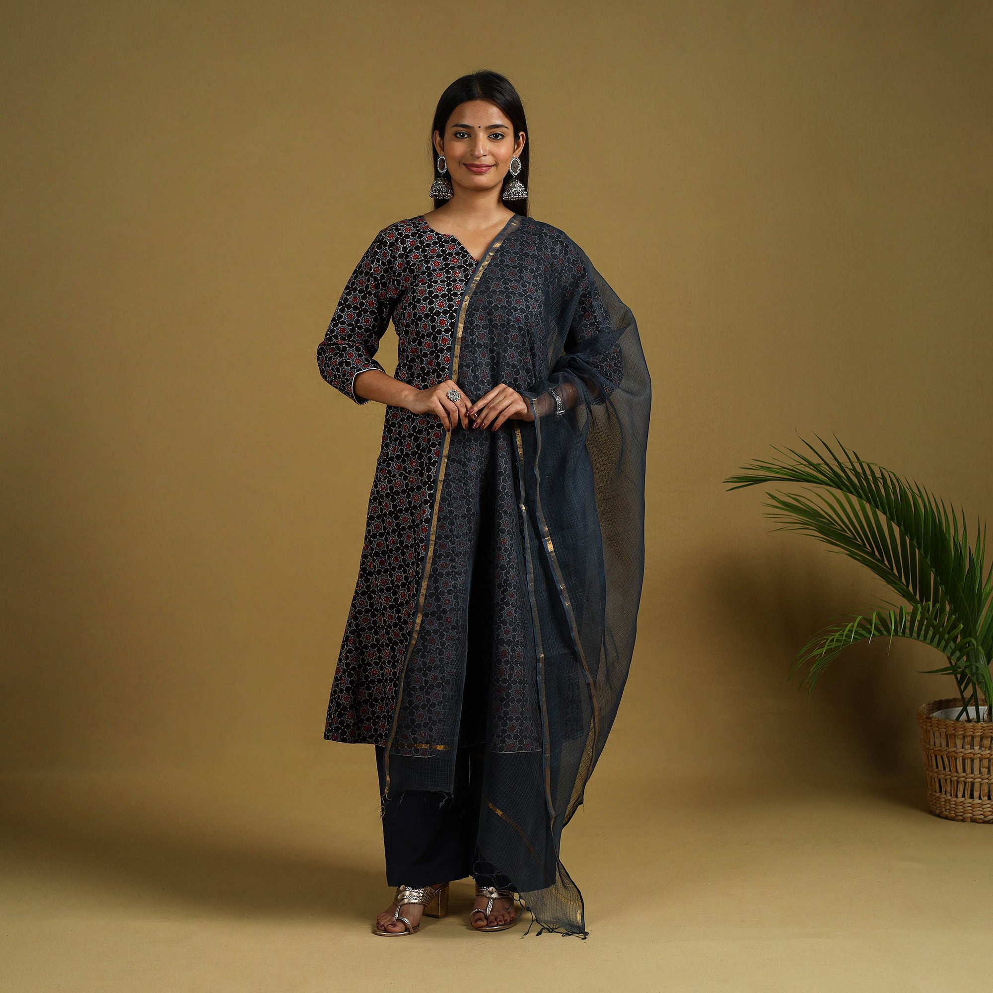 Embrace the beauty of ajrakh with this black cotton kurta set, featuring a hand block printed A-line kurta, a comfortable palazzo, and a kota doria dupatta. Crafted using traditional natural dyeing techniques, the kurta includes a convenient one-side pocket, and the palazzo has two side pockets. Soft, breathable, and stylish, this set is perfect for both casual days and festive occasions.
