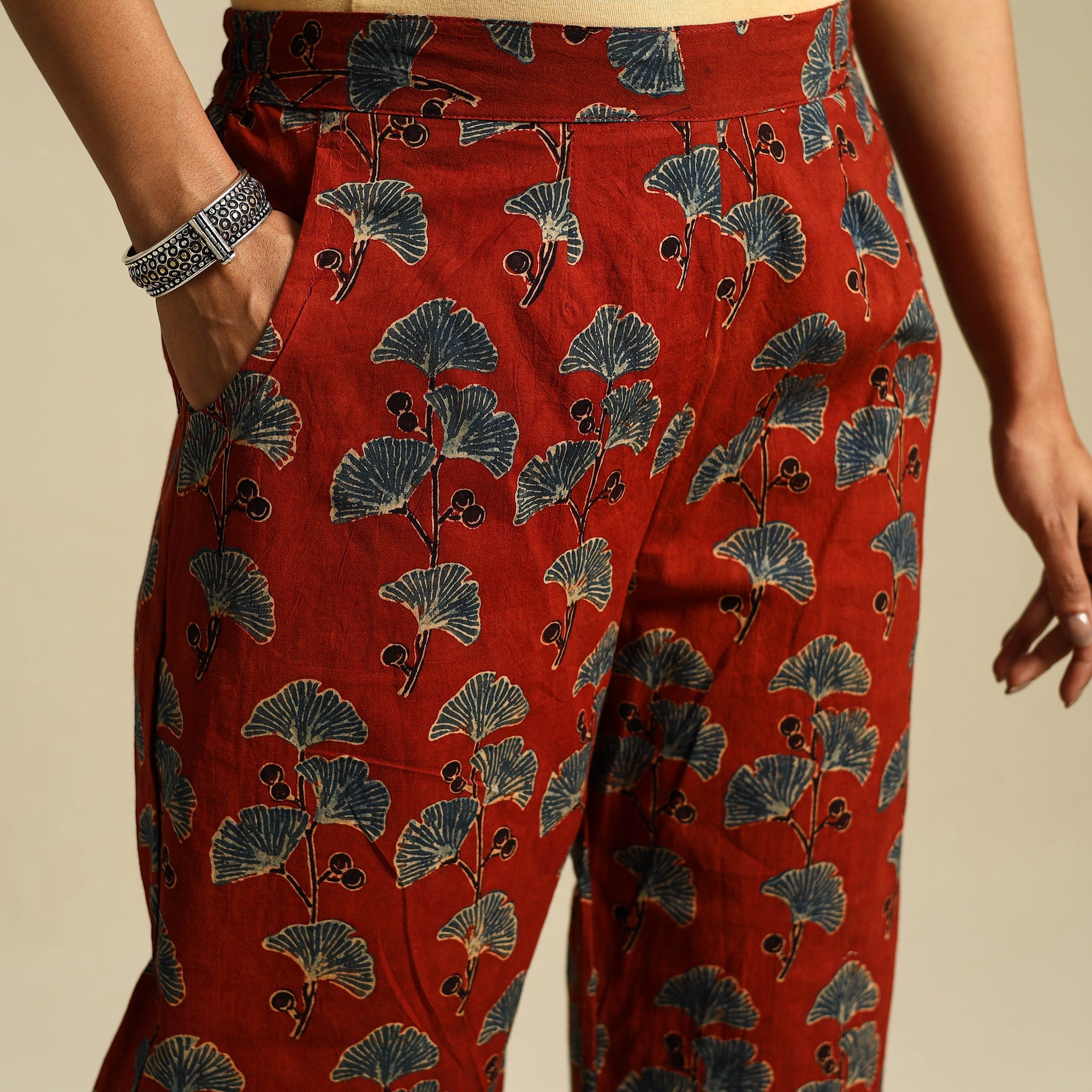 Stay comfortable and stylish in this red ajrakh cotton palazzo. Handcrafted using natural dyes and traditional block printing from Kutch, it features soft cotton fabric, an elasticated waistband, and two practical pockets. Pair it with a kurta or tunic for a graceful everyday look.