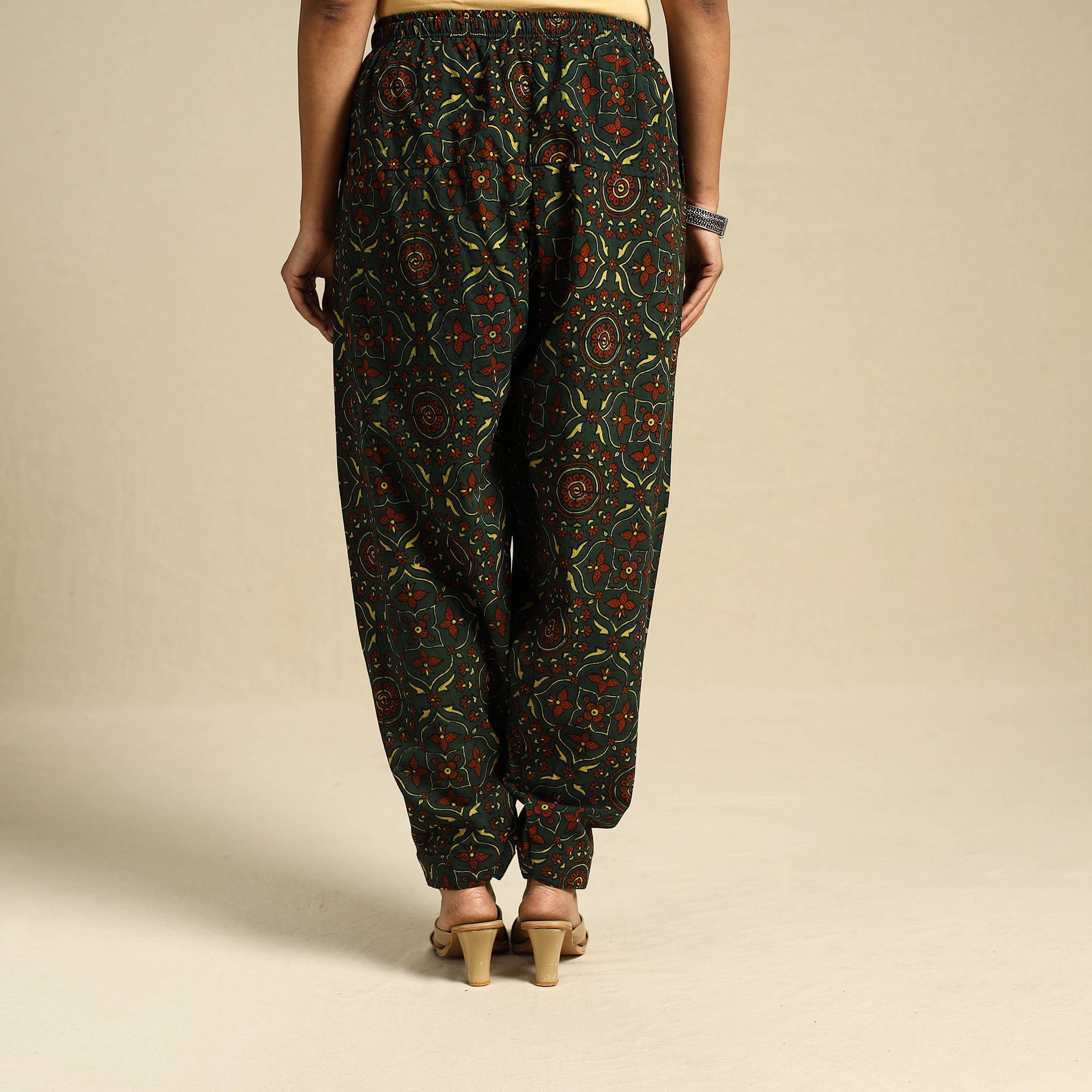 Stay comfortable and stylish in this green ajrakh cotton salwar. Handcrafted using natural dyes and traditional block printing from Kutch, it features soft cotton fabric, an elasticated waistband, and a handy side pocket. Pair it with a kurta or tunic for a graceful everyday look.
