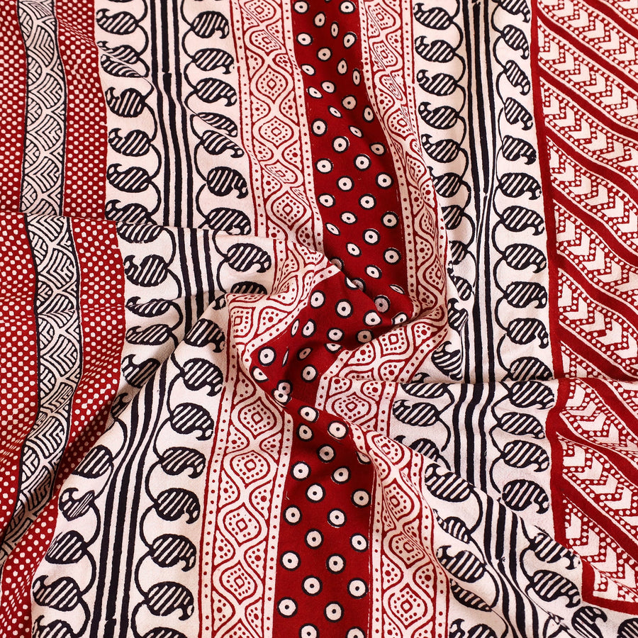 Bagh layouts are dramatic with the use of black and red alternately on a white background. Its production process is manually painstaking. Though the techniques and designs are age-old the prints retain their contemporary appeal.