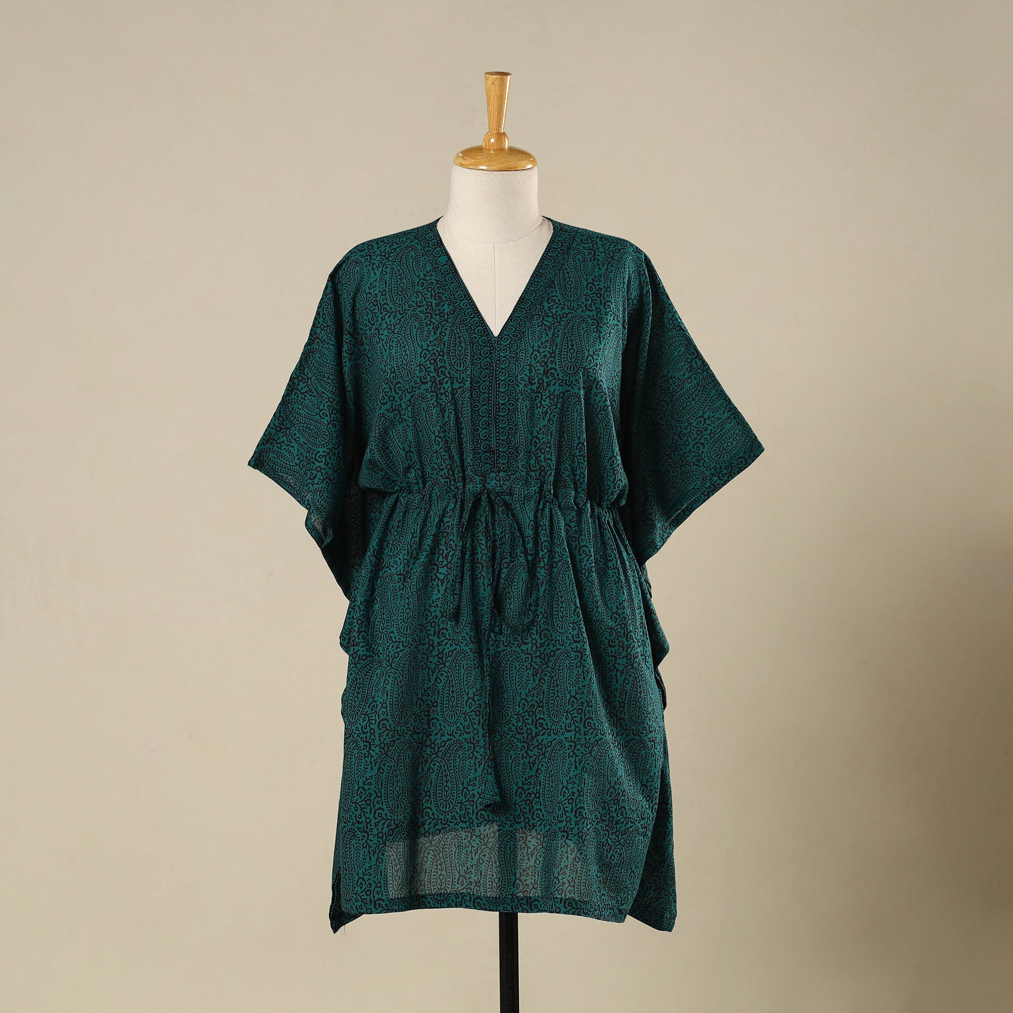 Step into timeless elegance with this green bagh block print kaftan, crafted for easy sophistication. The breathable cotton fabric offers a natural drape, while its free-flowing cut and adjustable waist tie create a flattering fit. Perfect for holidays, relaxed evenings, or casual outings, it blends cultural charm with everyday ease.