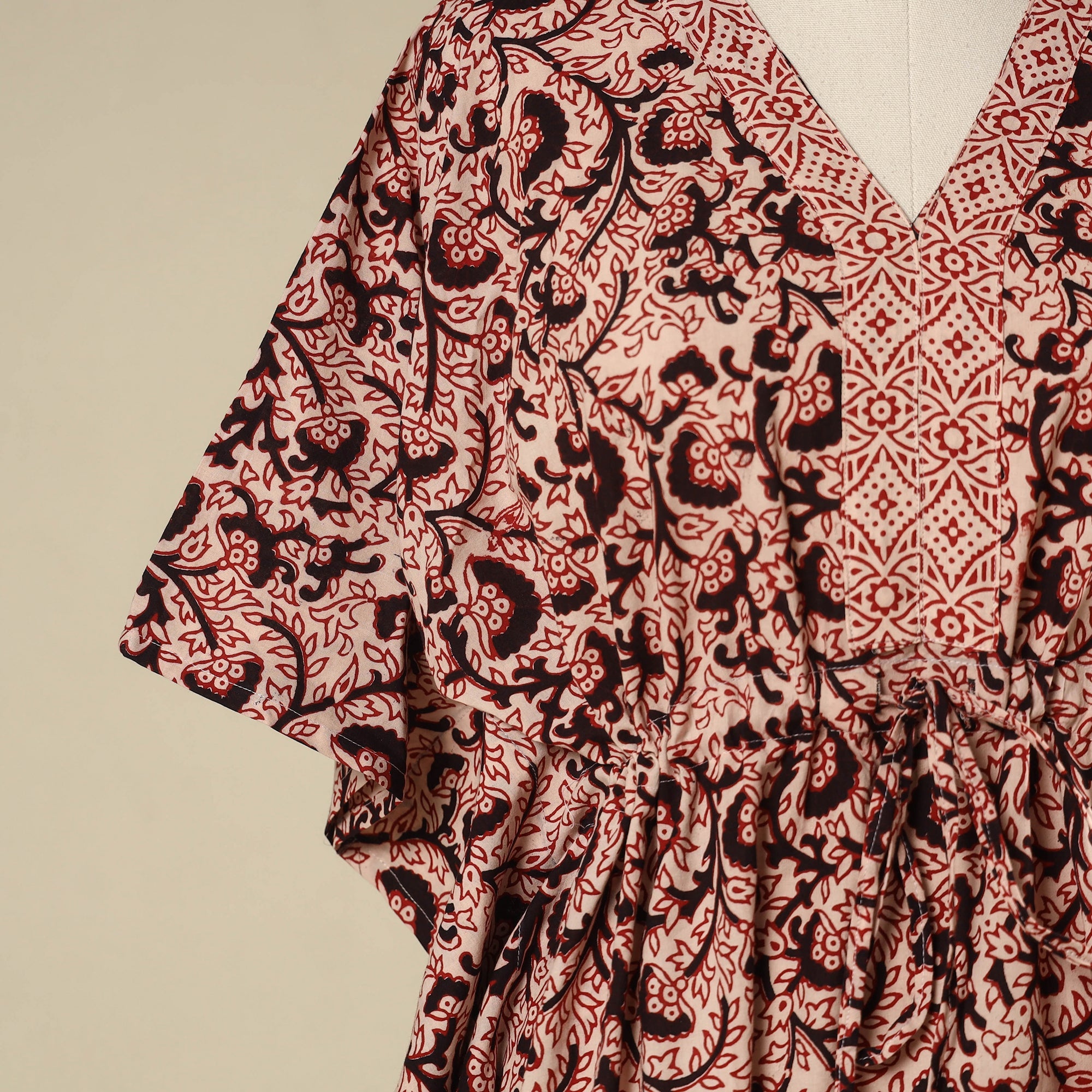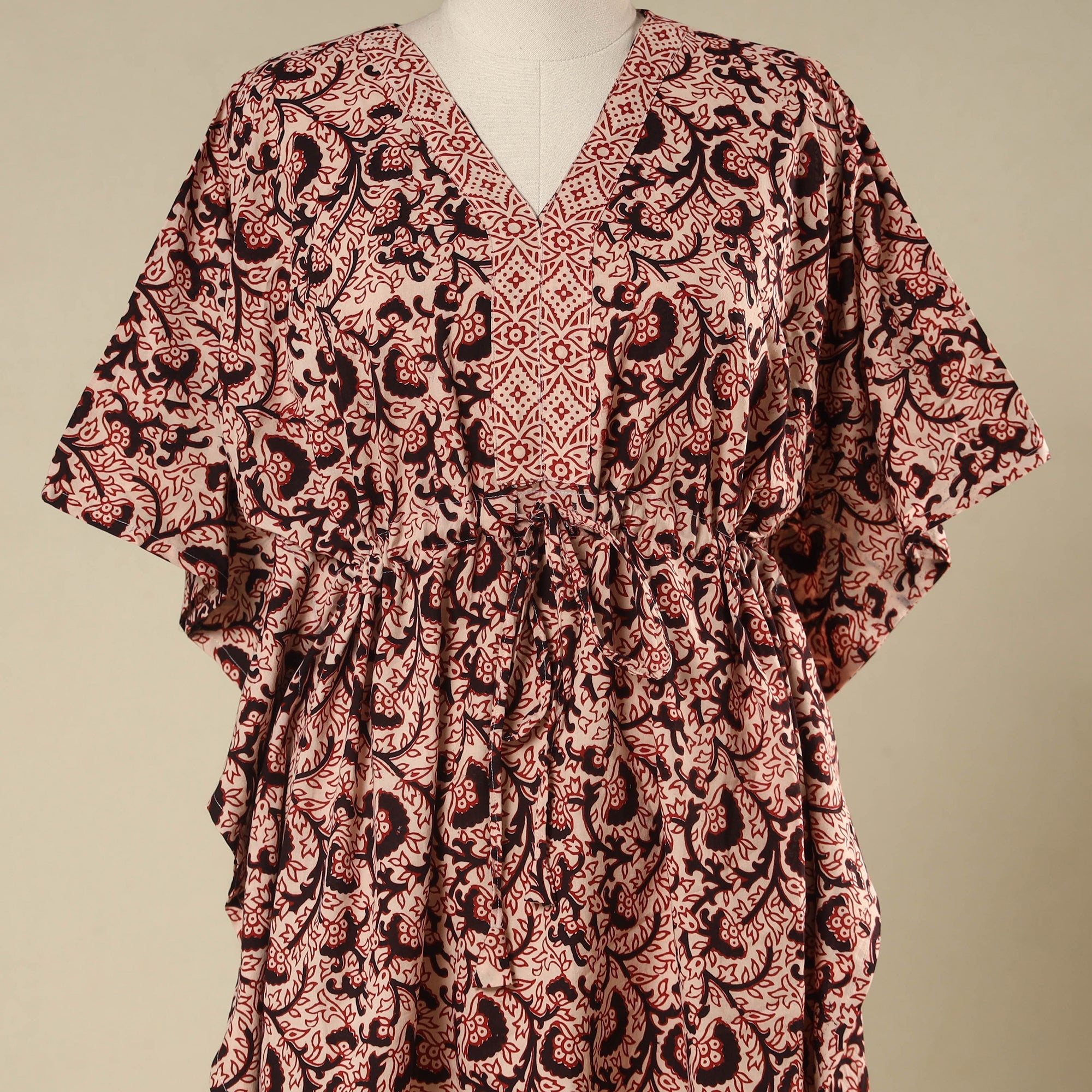 Beige - Block Print Cotton Bagh Kaftan with Tie-Up Waist (Medium) 25