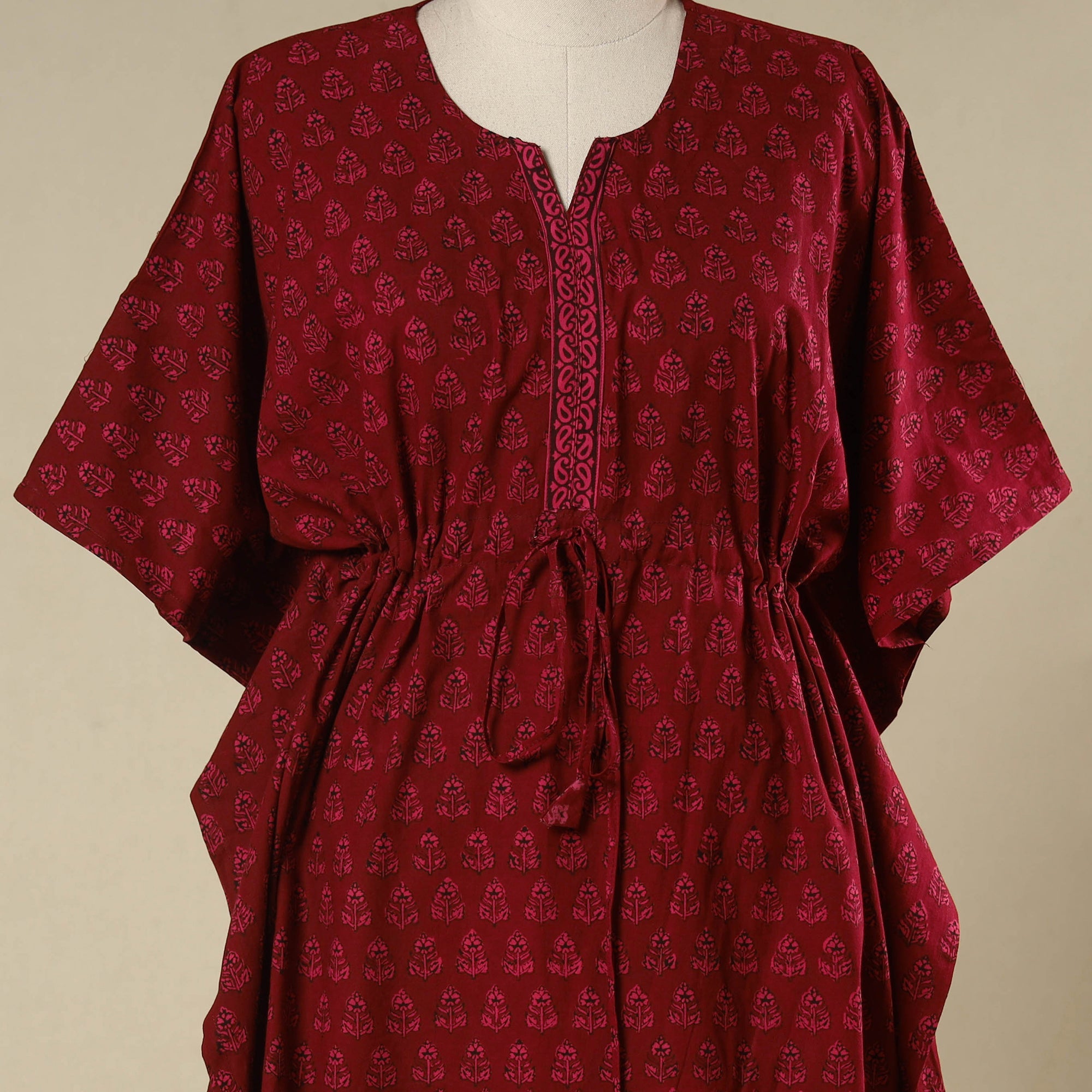 Red - Block Print Cotton Bagh Kaftan with Tie-Up Waist (Medium) 26