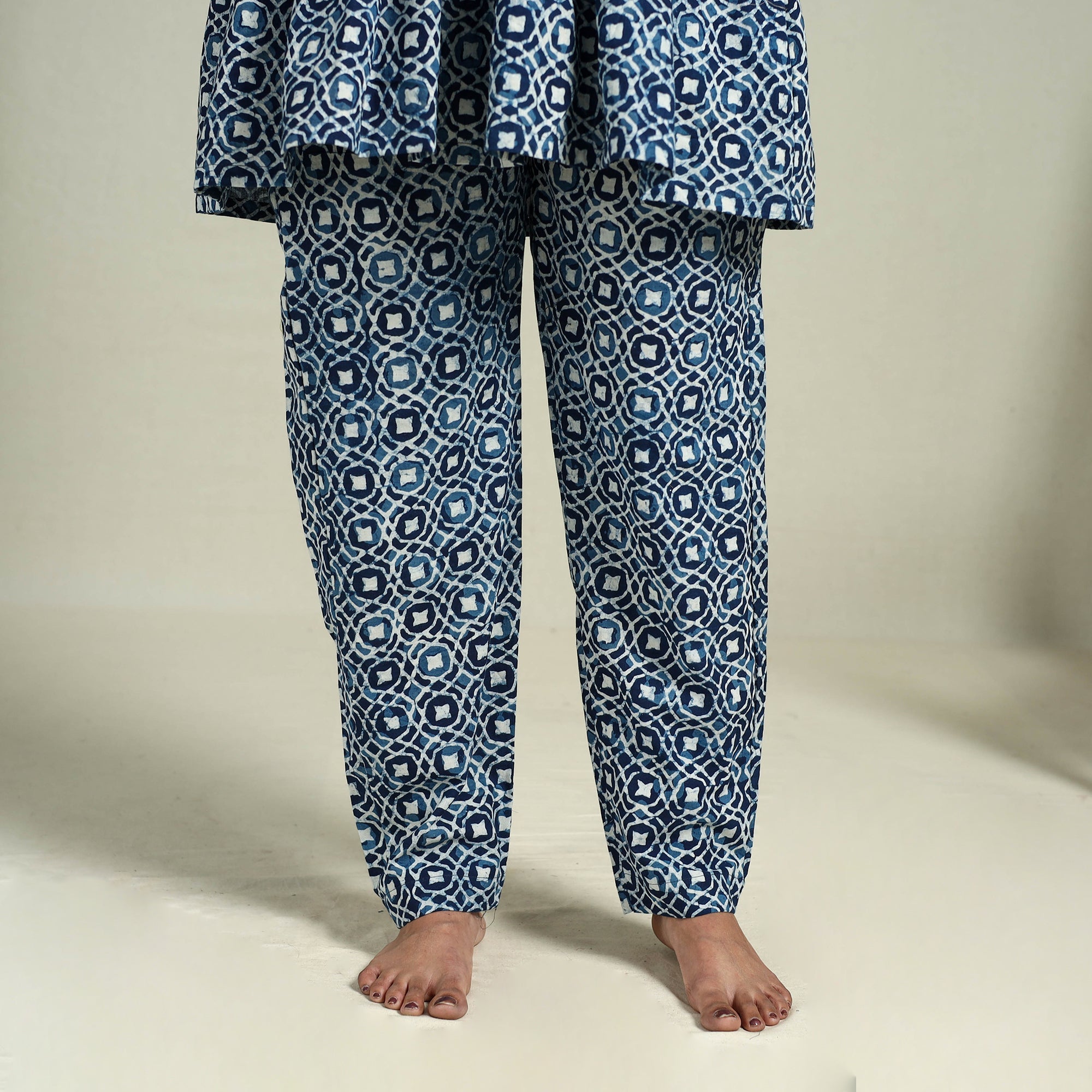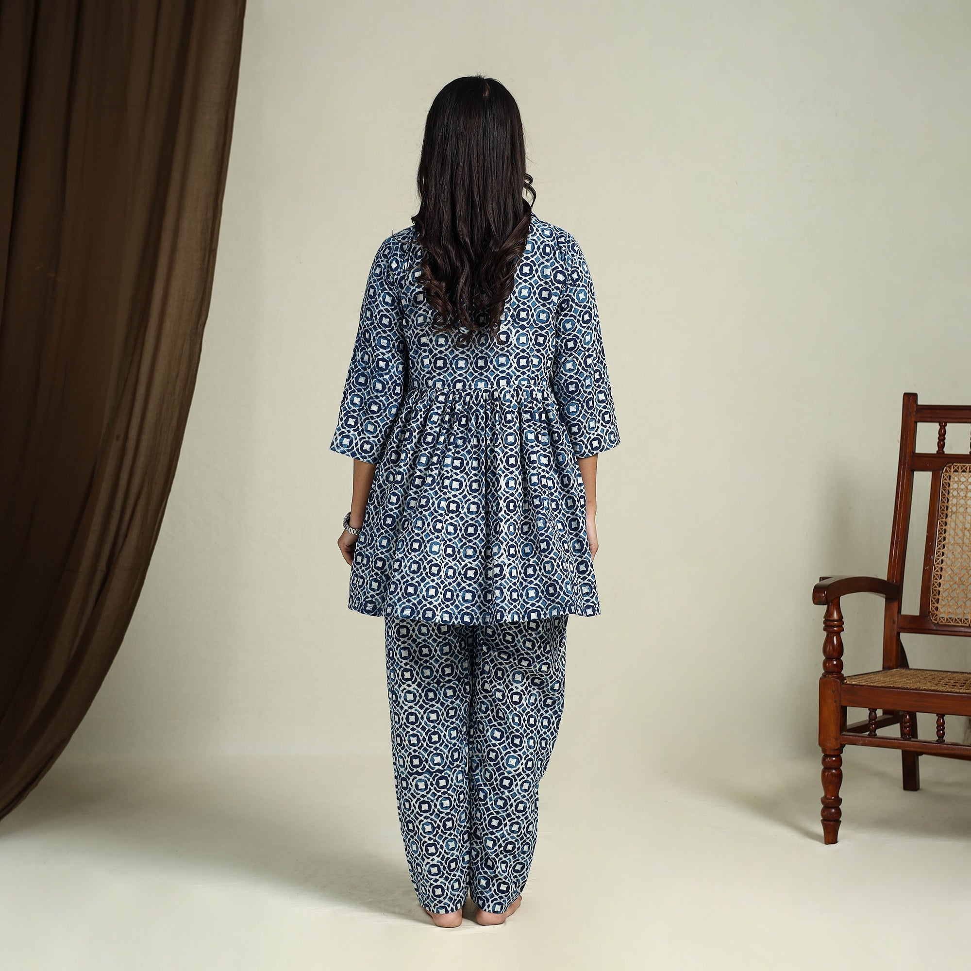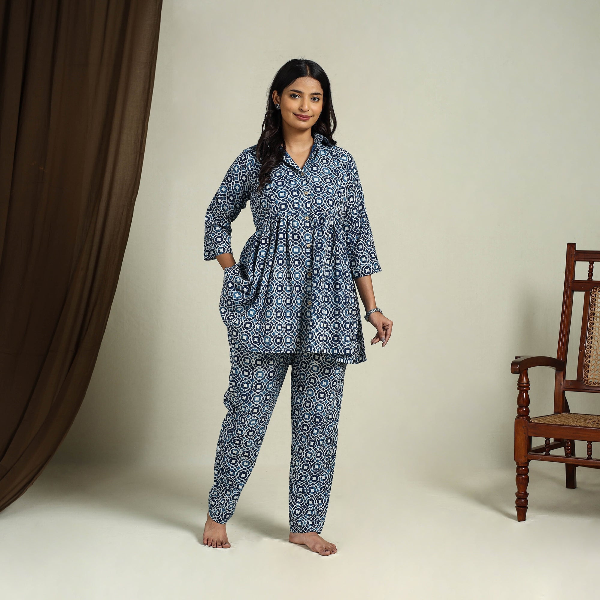 Experience relaxed comfort with this blue bagru cotton night suit set, featuring a hand-block printed top and matching pants with an elasticated waist and convenient side pockets. Crafted from cotton naturally dyed using traditional methods, the fabric offers lasting softness and breathability for a restful sleep.
